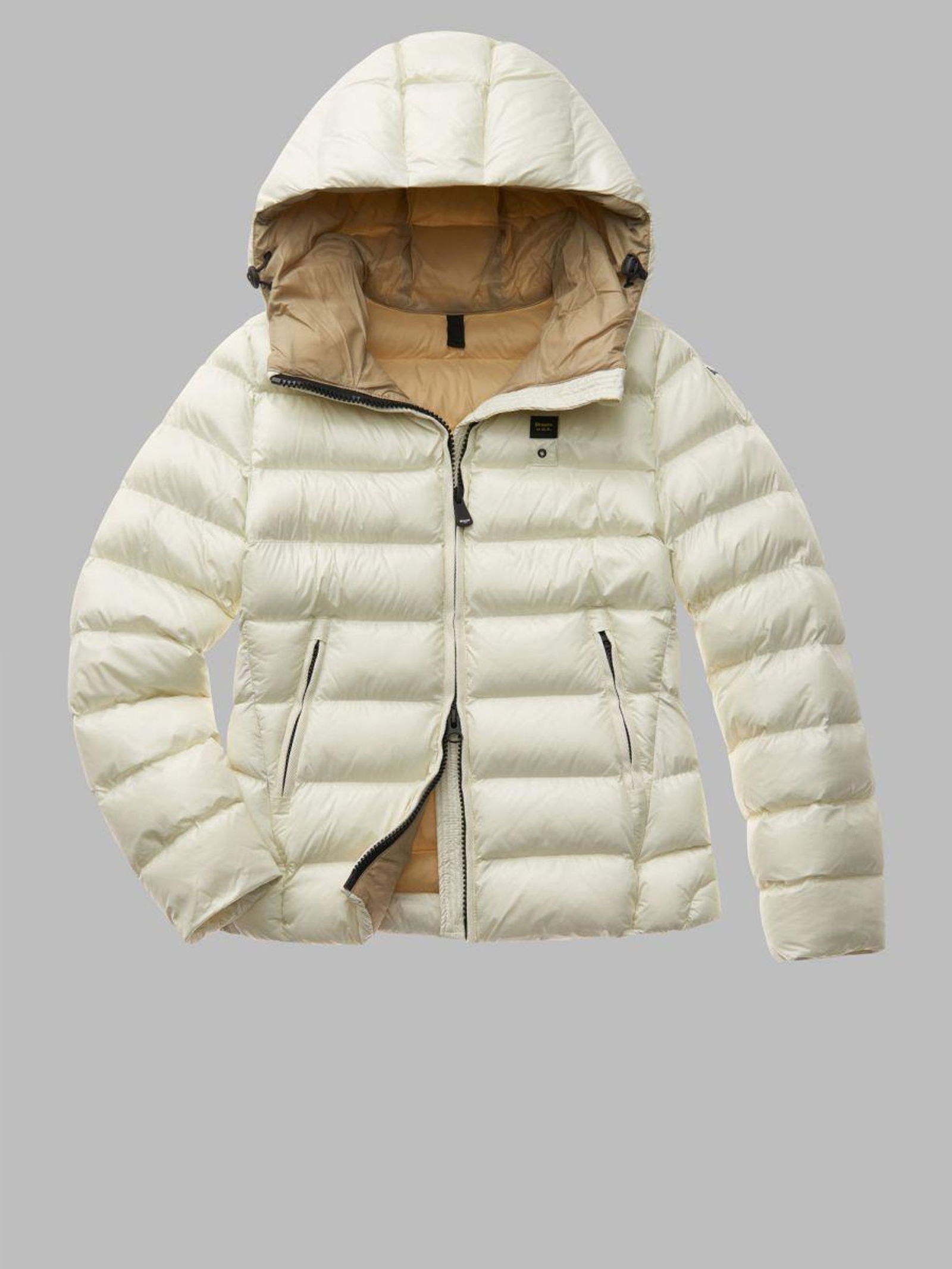 Elastischer Tunnelzug an der Kapuze und am Jackenbund. Links auf der Brust ist die farblich passende typische Blauer-Schlaufe angenäht, auf dem linken Ärmel farblich passendes Abzeichen.