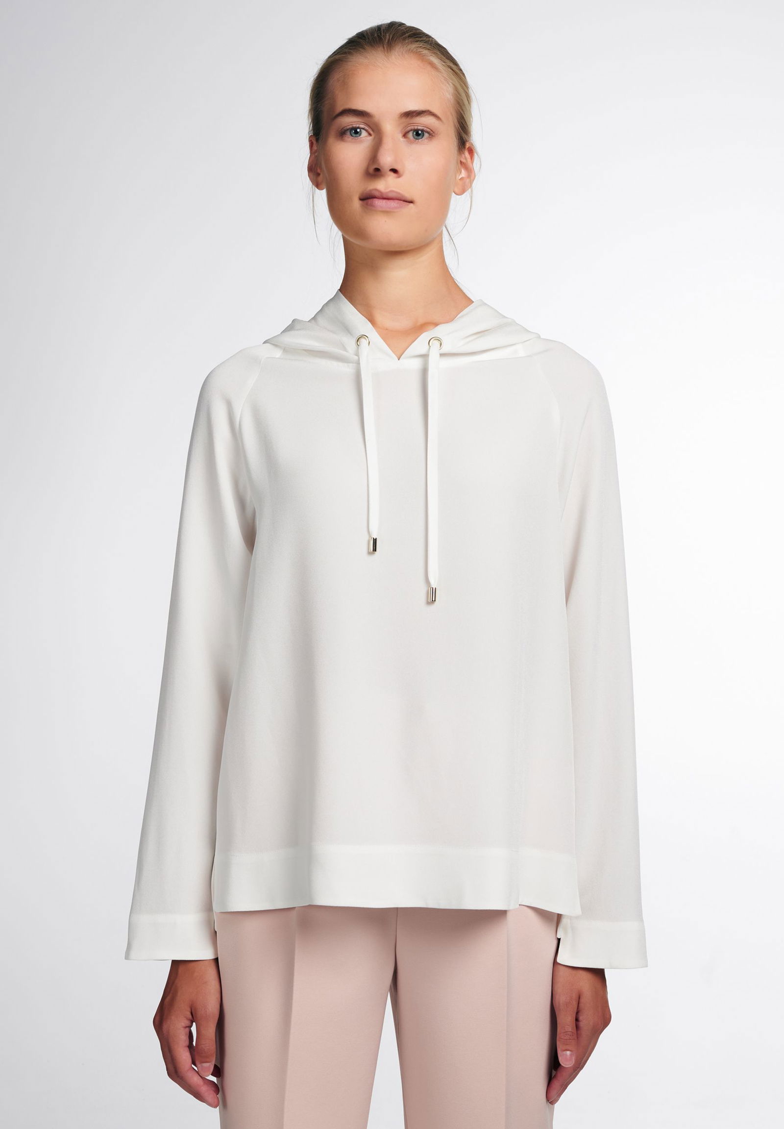 Ein sicherer und trendiger Styling-Tipp für Frauen, die Lust auf etwas Besonderes haben, ist dieses Blusenshirt aus unserem Premiumsegment, mit Kordelzug-Kapuze.
