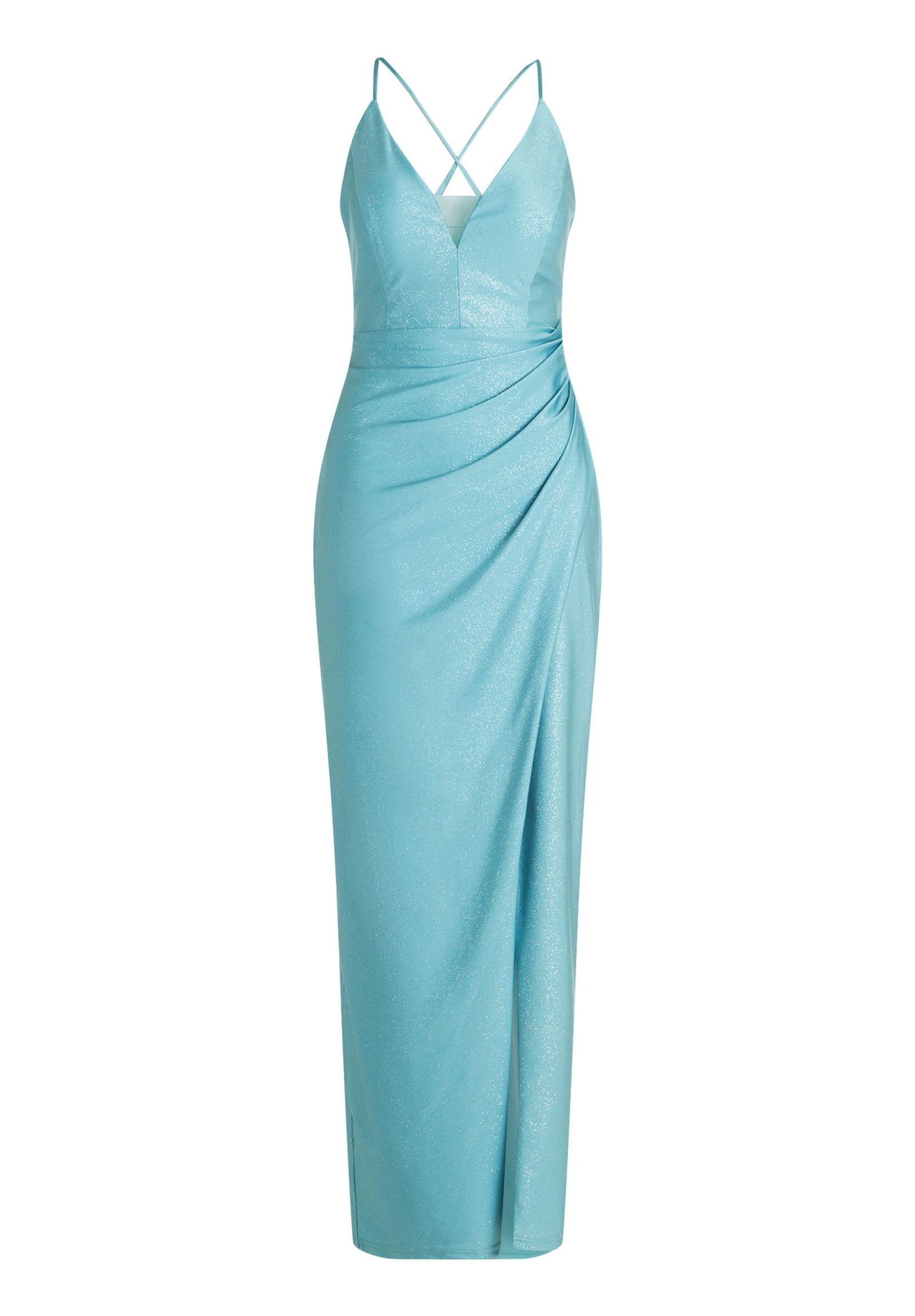 Dieses stilvolle Abendkleid von Mascara London präsentiert sich in einem edlen Petrol-Blau eine moderne, luxuriöse Farbnuance, die jedem Anlass Eleganz und Tiefe verleiht. Die figurbetonte Silhouette sorgt für einen femininen, anmutigen Auftritt. Das Oberteil besticht durch einen eleganten V-Ausschnitt und zarte Spaghettiträger, die dem Kleid eine leichte und zugleich glamouröse Note verleihen. Die raffinierten Drapierungen im Brust- und Taillenbereich formen eine wunderschöne Silhouette und schmeicheln der Figur. Der lange, schmal verlaufende Rock fließt weich nach unten und zeigt einen seitlichen Beinschlitz, der moderne Eleganz und Bewegungsfreiheit perfekt kombiniert. Das hochwertige, weich fallende Material sorgt dafür, dass das Kleid bei jeder Bewegung anmutig mitschwingt.