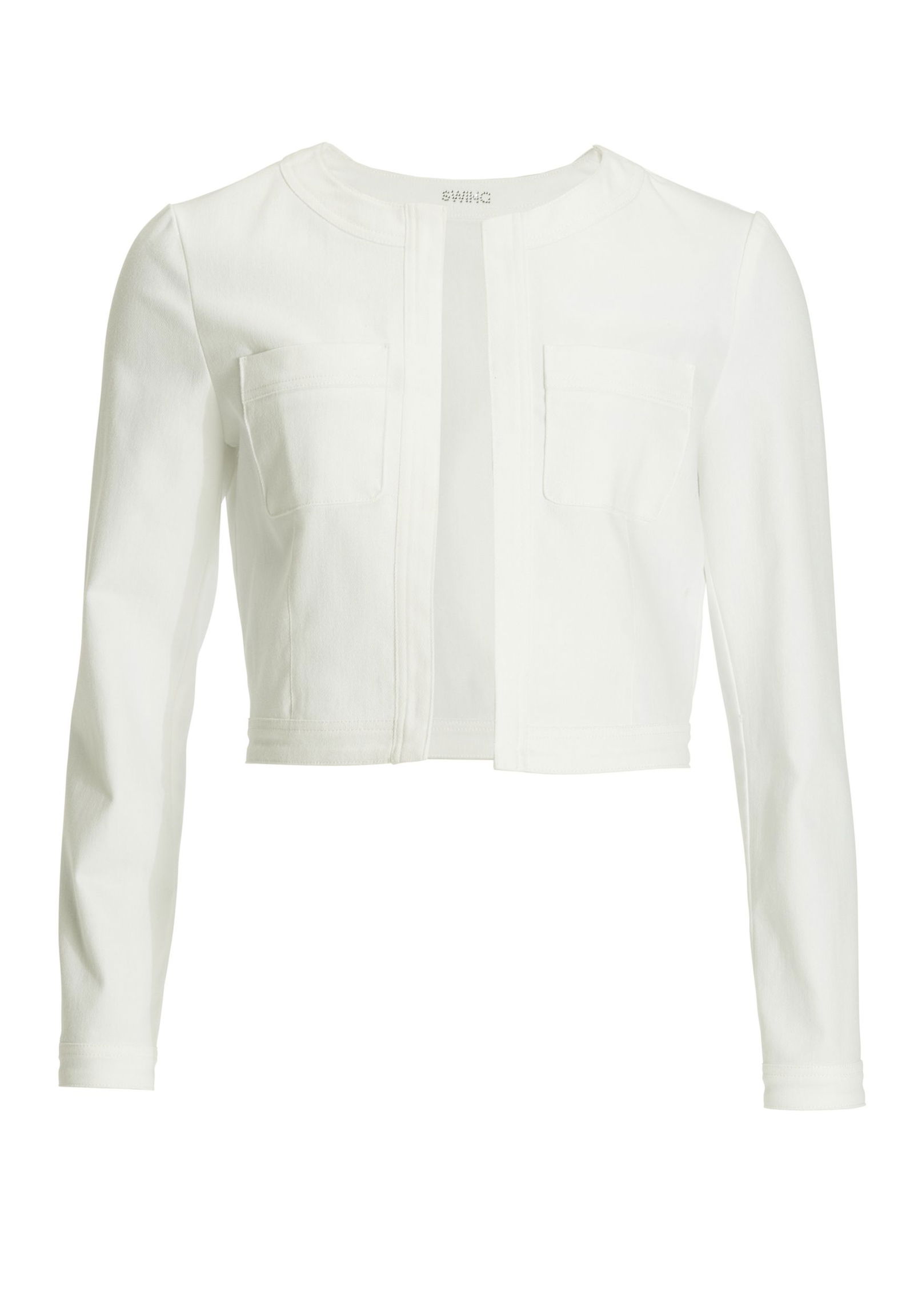 Der Bolero von SWING ist aus Jersey gefertigt und schmal geschnitten. Er zeigt sich mit offener Vorderseite und Dreiviertelärmeln.