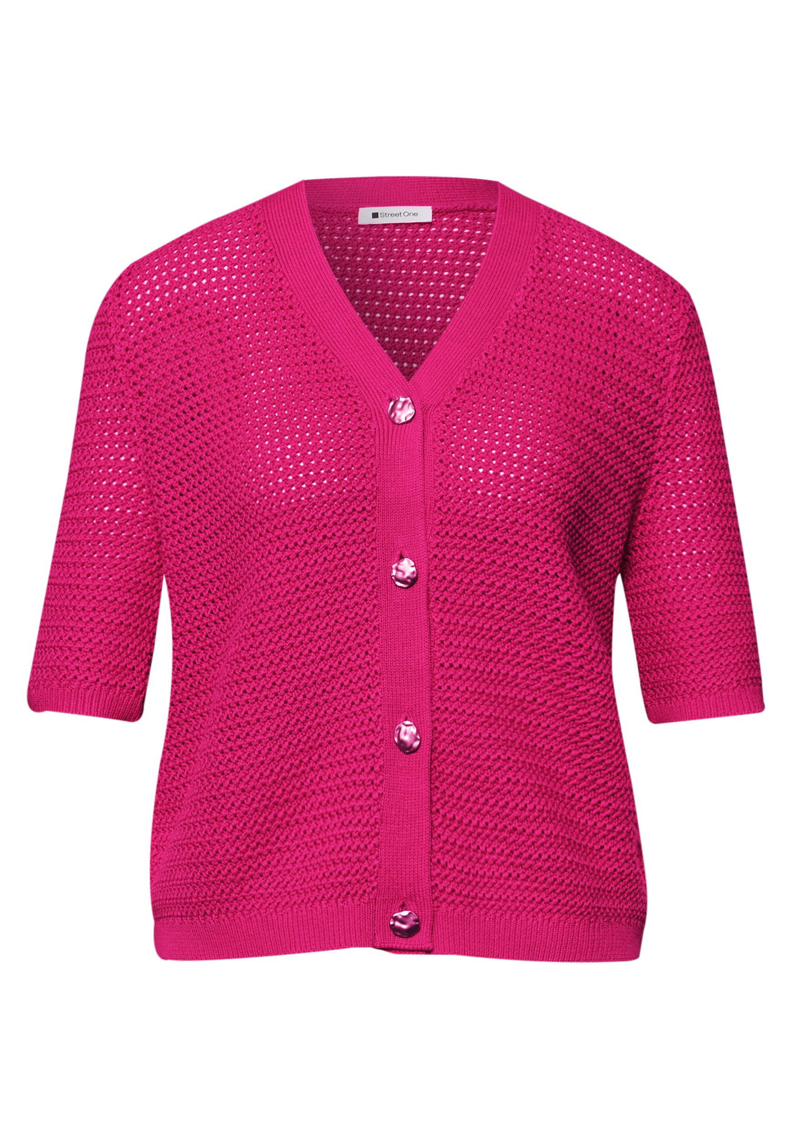Der sommerliche Cardigan von Street One für Damen überzeugt mit seiner leichten, durchscheinenden Strickstruktur aus reiner Baumwolle. Der V-Ausschnitt und die kurzen Ärmel verleihen der Strickjacke eine feminine, luftige Note. Dank der Unifarbe lässt sie sich vielseitig kombinieren – ideal für entspannte Casual-Looks an warmen Tagen. Die softe Qualität sorgt dabei für ein angenehm leichtes Tragegefühl. Baumwoll Strickjacke Casual V-Ausschnitt Kurzarm Sommerlich und leicht Material: 100% Baumwolle