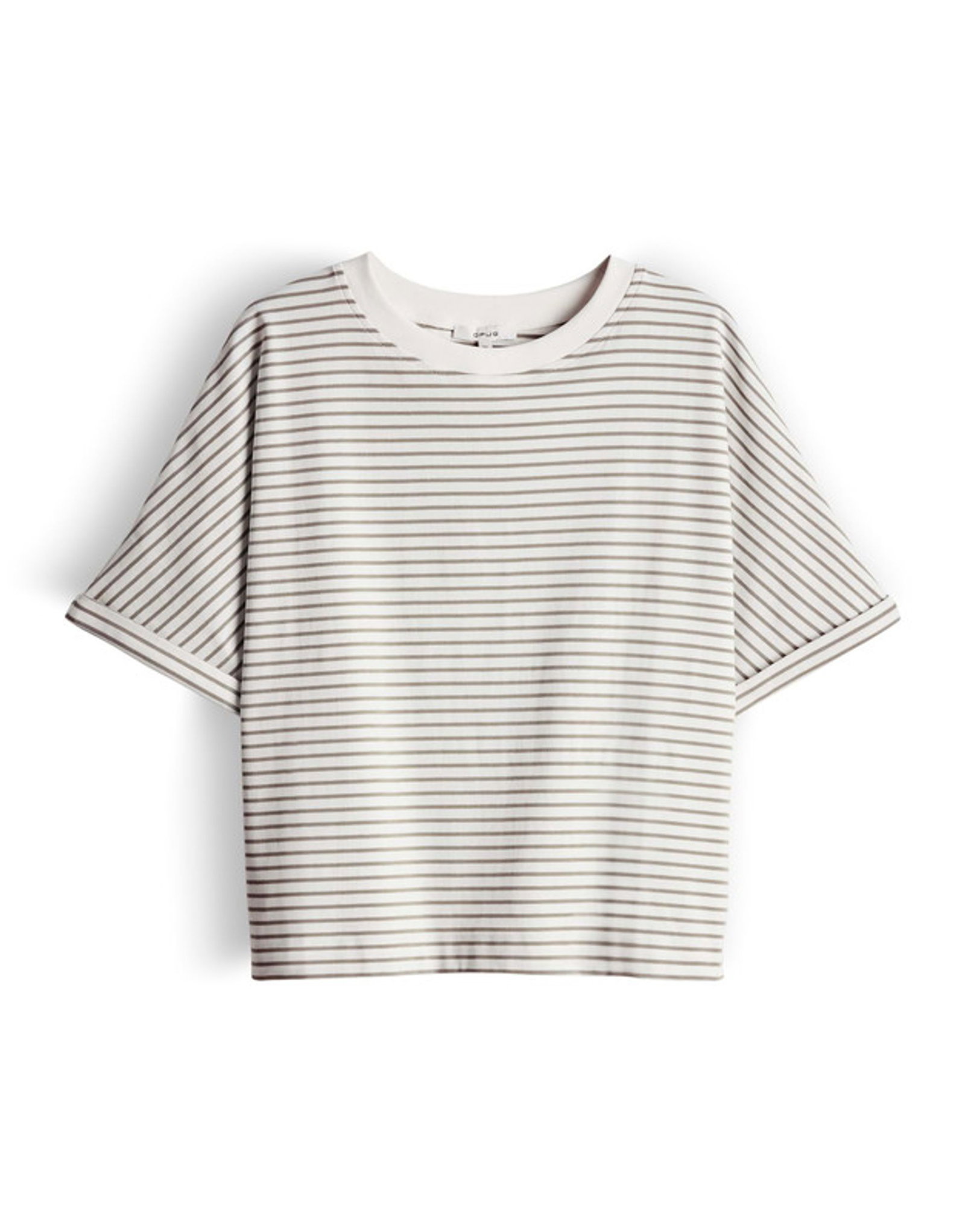 weite Passform, Boxy Fit, überschnittener Kurzarm, Rundhalsausschnitt, Rückenlänge ca. 56 cm bei Größe 36, Model Größe 177 cm – trägt Größe 36, Jersey, glatter Griff, leicht elastisch, Streifenmuster, Schlitze in den Seiten