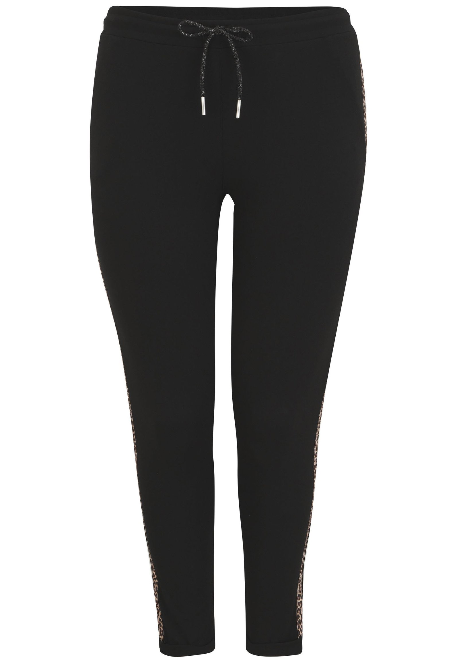 Die Hose im Joggpant-Stil von Doris Streich hat zwei Taschen und einen Tunnelzug mit Band. Seitlich hat sie ein dekoratives Leo-Band aufgesetzt. Gefertigt ist diese Hose aus elastischer crêpiger Wirkware.