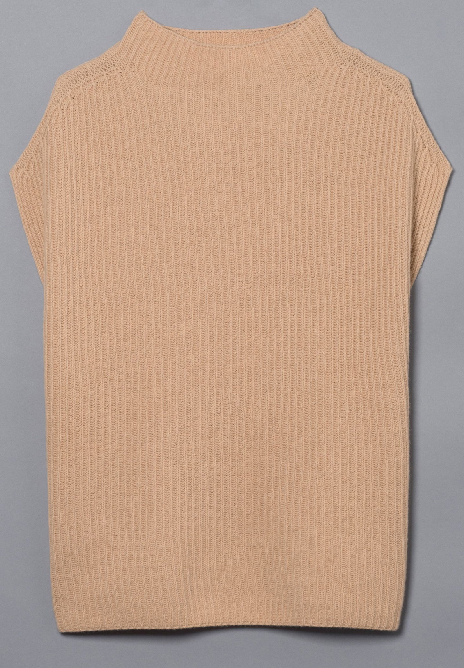 Unser Ohne-Arm Pulli ist kuschelig weich und der Stoff ist von bester Qualität (70% Schurwolle/Merino, 30% Kaschmir), was ein luxuriöses Tragegefühl verspricht.