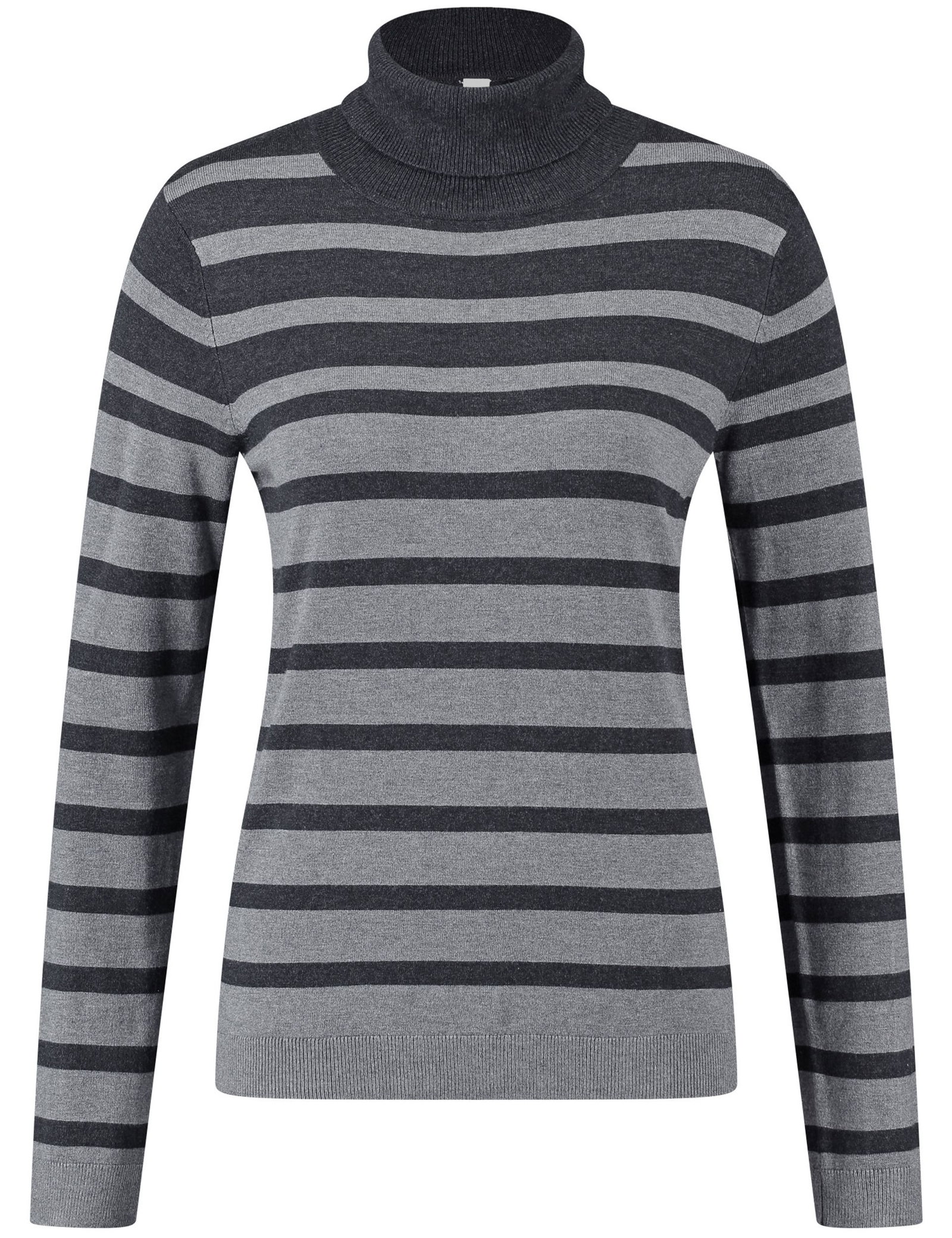 Unifarbener Kragen. Logocoin auf dem Rücken. Mit dem kontrastfarbig geringelten Rollkragenpullover finden Sie viele Kombinationsmöglichkeiten. Der Feinstrick verleiht ein tolles Tragegefühl, der sich gerade an kälteren Tagen auch prima unterziehen lässt.