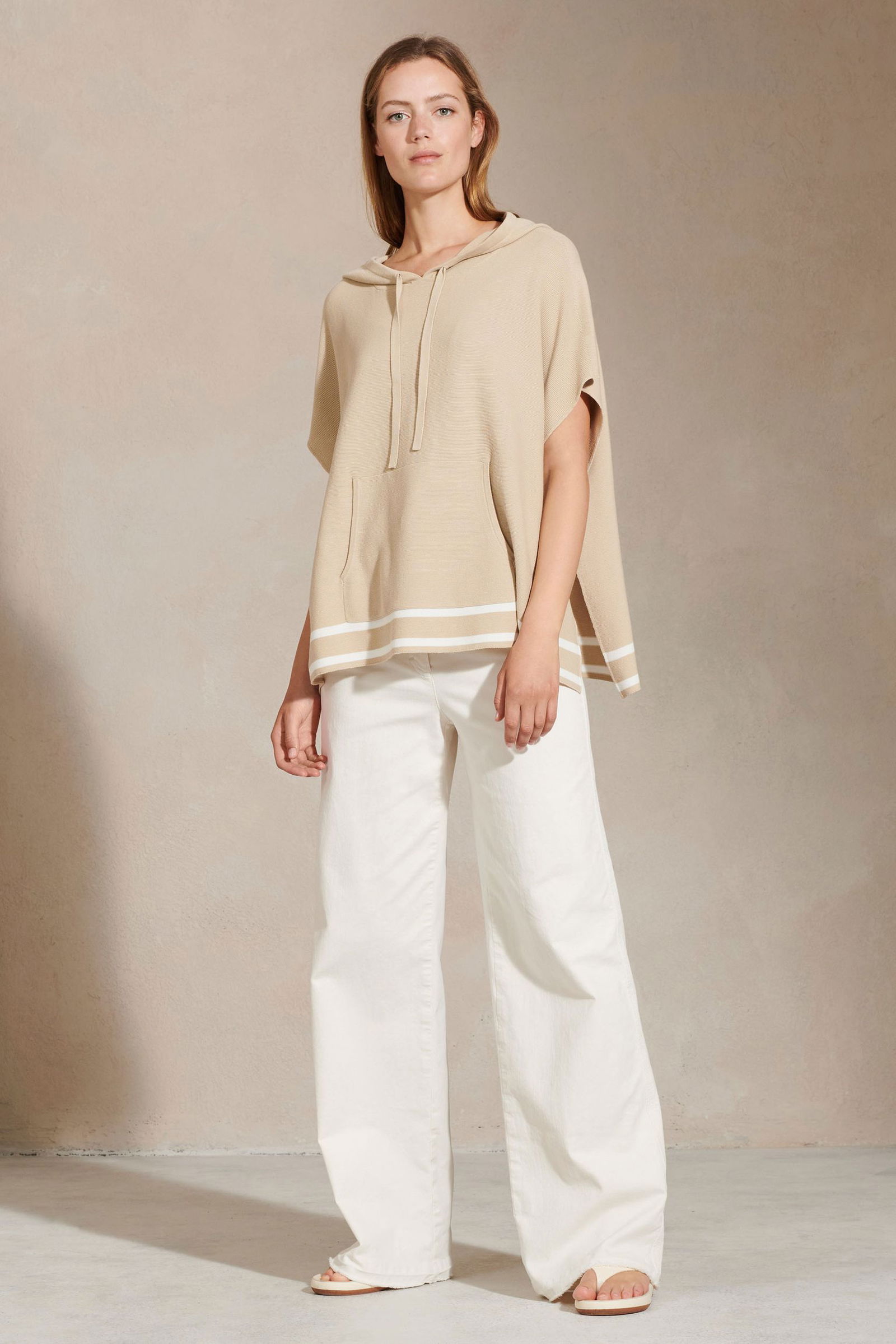 Ärmelloser Cape-Pullover mit edlem Streifen-Detail. Der Hoodie wurde aus nachhaltiger, BCI-zertifizierter Baumwolle hergestellt und ist auf der Vorderseite mit einer Kängurutasche ausgestattet.
