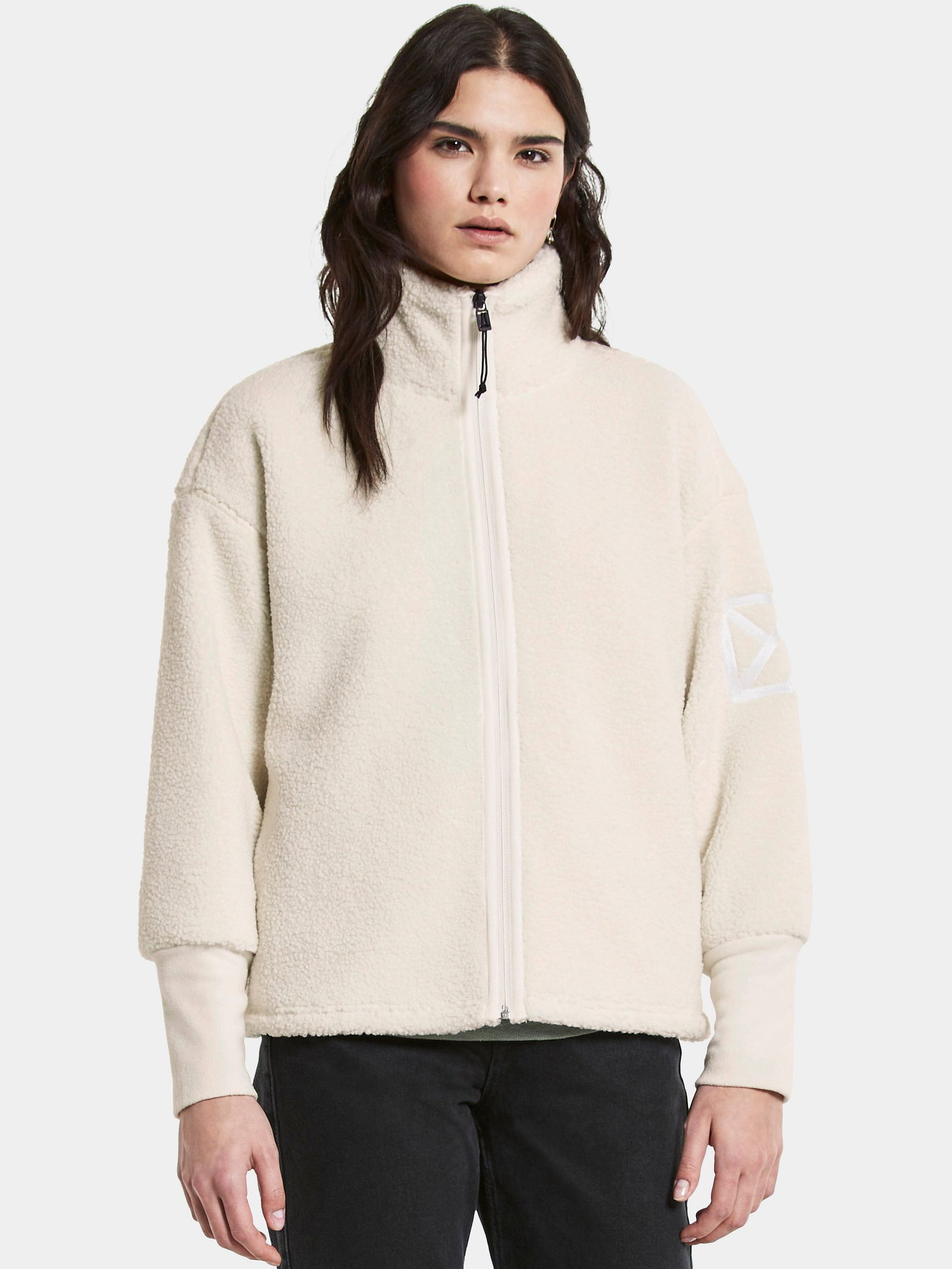 Cozy pile jacket with long cuffs. Perfect to wear under for example LANA parka, Soft pile fabric bounded with fleece backing. Relaxed / Straight shape, Nice logo embroidery on the left arm, slightly longer cuffs for better comfort, cosy pile fabric with bounded fleece inside