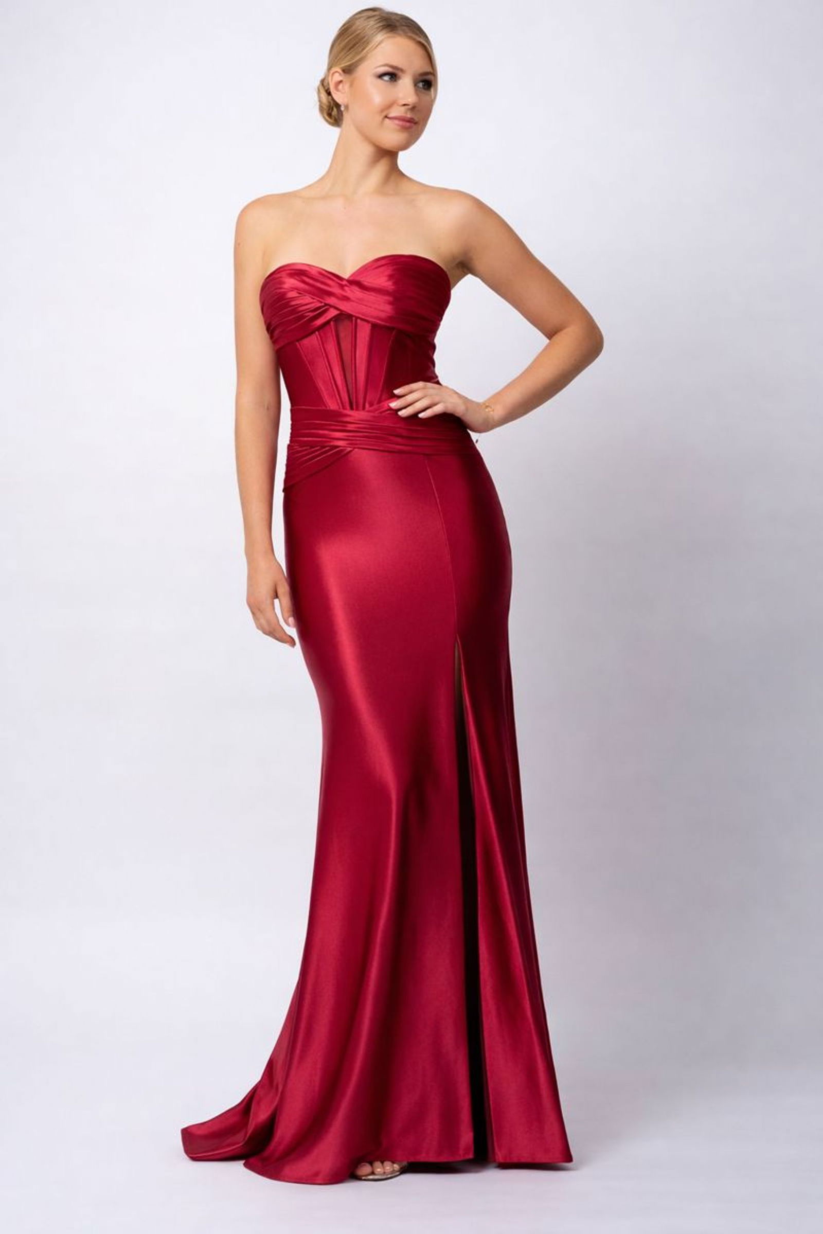 Das schulterfreie Bustier-Oberteil ist kunstvoll drapiert und zeigt eine raffiniert überkreuzte Faltenführung, die das Dekolleté wunderschön betont. Ein transparenter Mesh-Einsatz sowie dezente Corsagenstäbchen sorgen für Halt, Struktur und eine feminine Silhouette.