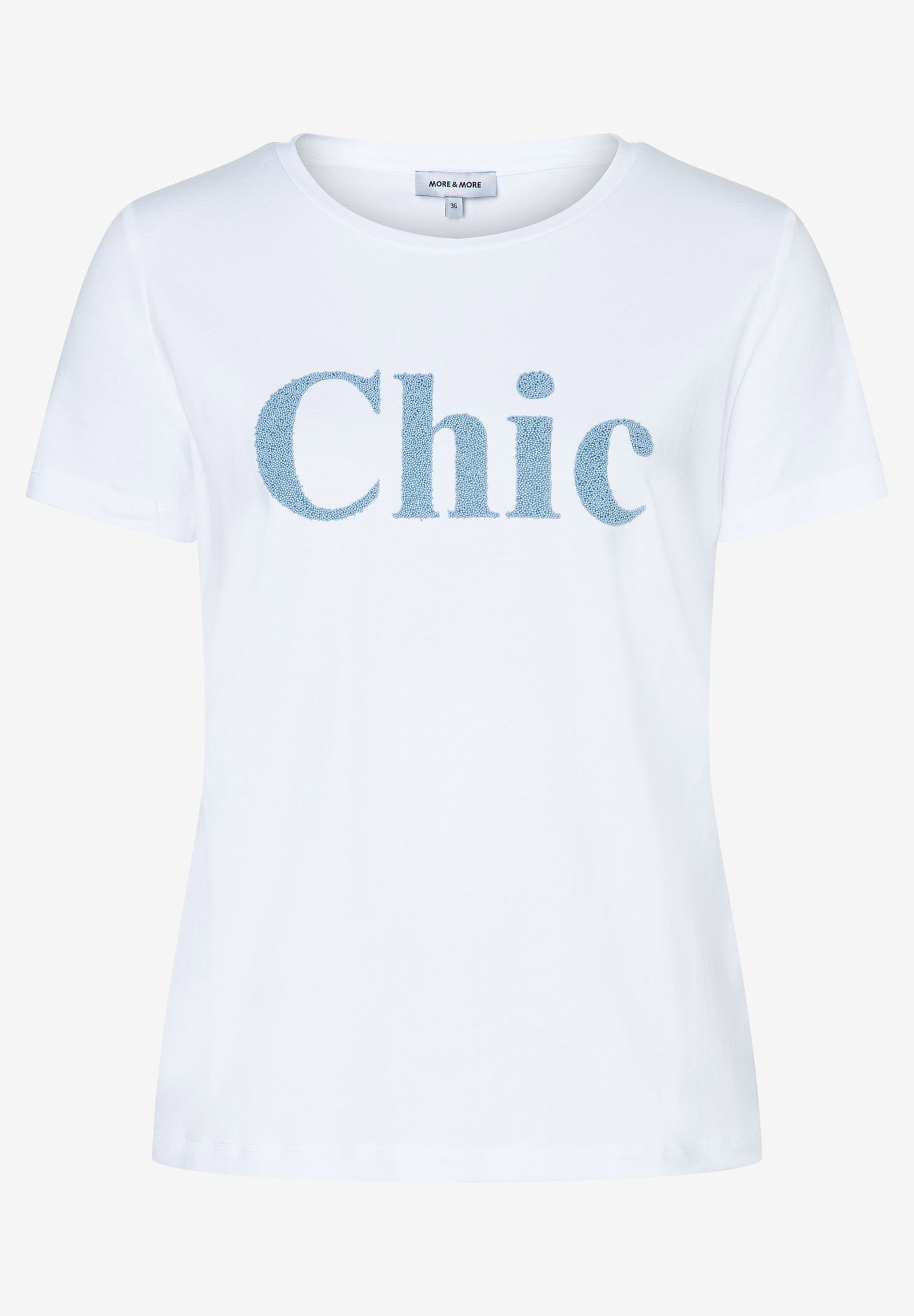 Das weiße Kurzarmshirt von MORE & MORE präsentiert sich mit markanter Perlenaufschrift auf der Front und sorgt für einen minimalistischen Statement-Look. Das zeitlose Design macht es zum vielseitigen Basic für stilvolle Casual-Outfits - perfekt kombinierbar zu Hose und Rock, oder auch zum klassischen Businessanzug.