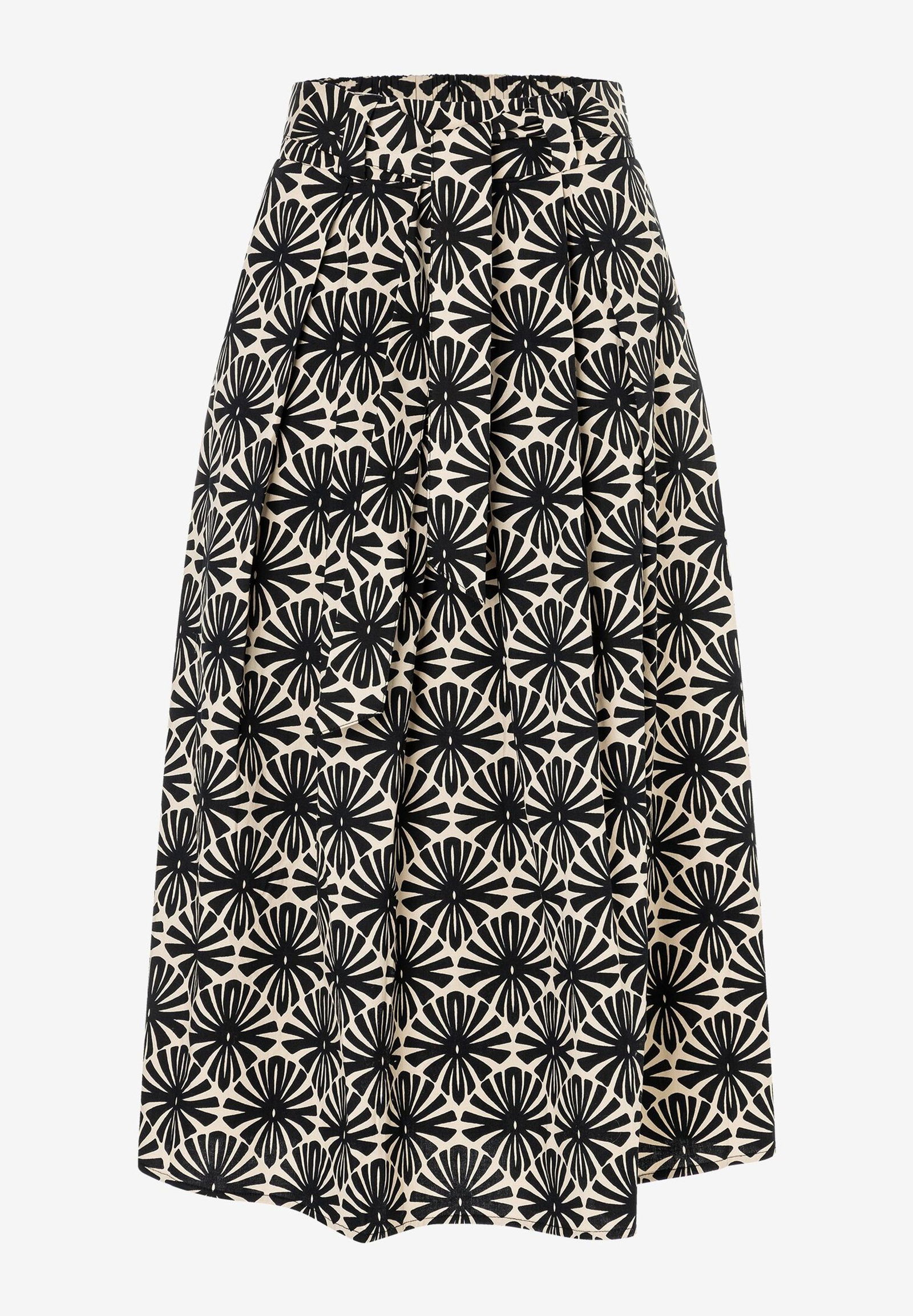 Den weit-ausgestellten Baumwollrock von MORE & MORE mit grafischem Allover-Print in schwarz/sand und Bindegürtel können Sie ganz casual mit T-Shirt und Sneakers stylen oder aber etwas eleganter mit Blusentop und Heels.