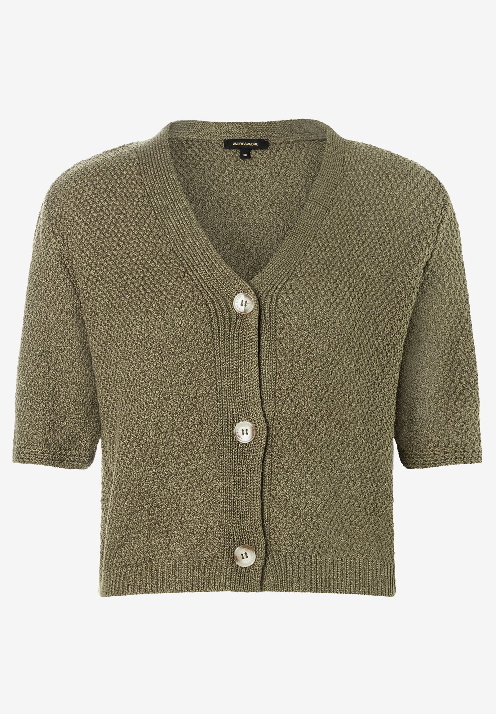 Der edel-schimmernde, kurze Cardigan von MORE & MORE mit sommerlicher Struktur und V-Ausschnitt kann hervorragend über Kleider und Tops getragen werden.