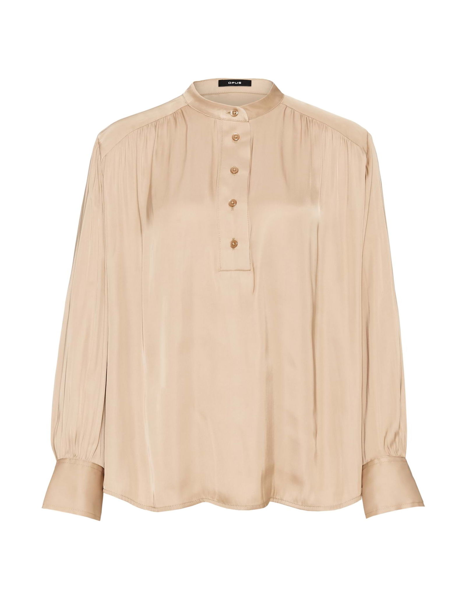 satiniert, fließend zart, Stehkragen mit kurzer Knopfleiste, Weiter, geraffter Ärmel mit Manschetten, Hinten länger als vorne, Abgerundeter Saum mit Schlitzen in den Seiten
