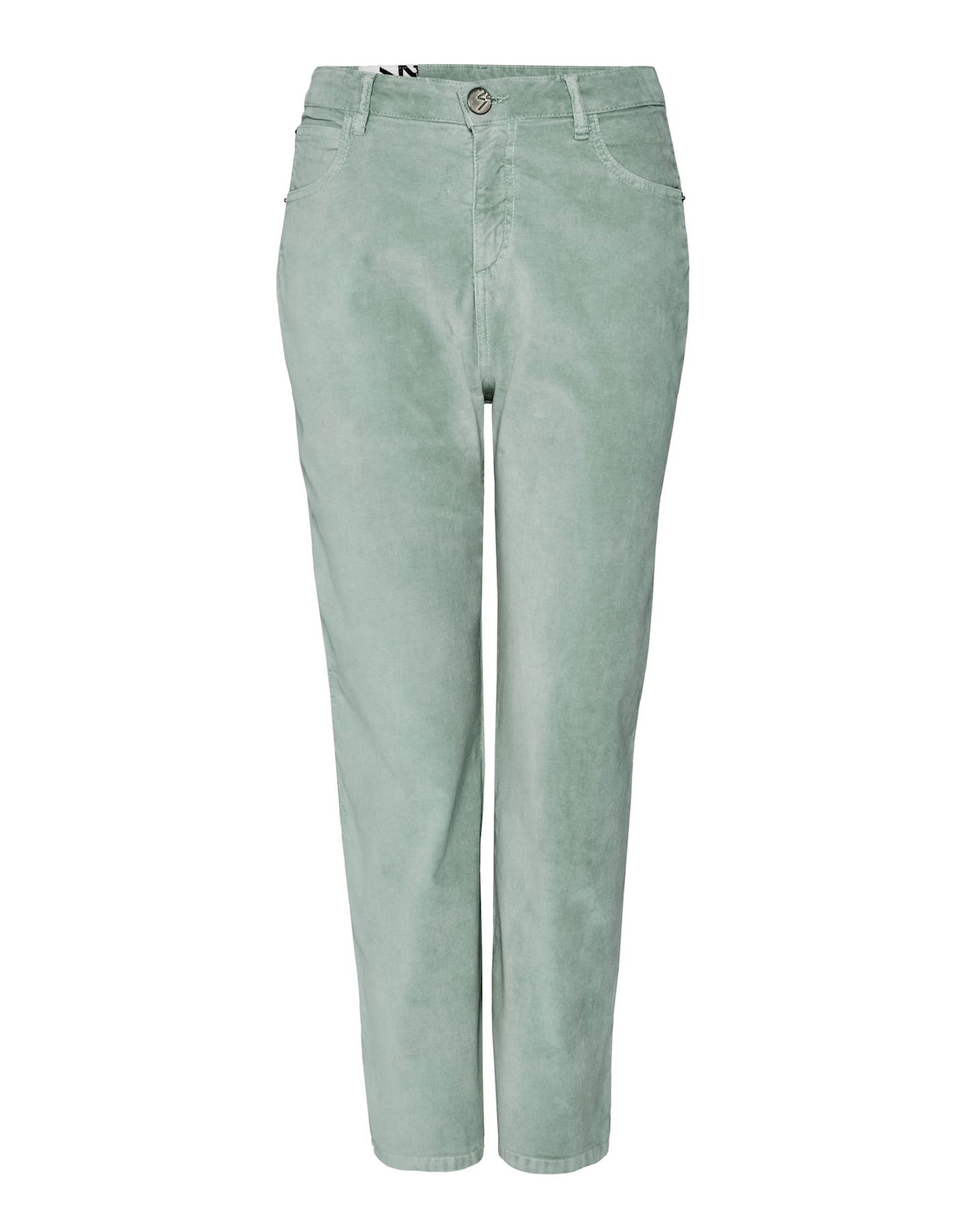 Baumwoll-Mix, samtartige Oberfläche, verkürztes, weites Bein, 5-Pocket-Design, das Model ist 176 cm groß und trägt Größe 36