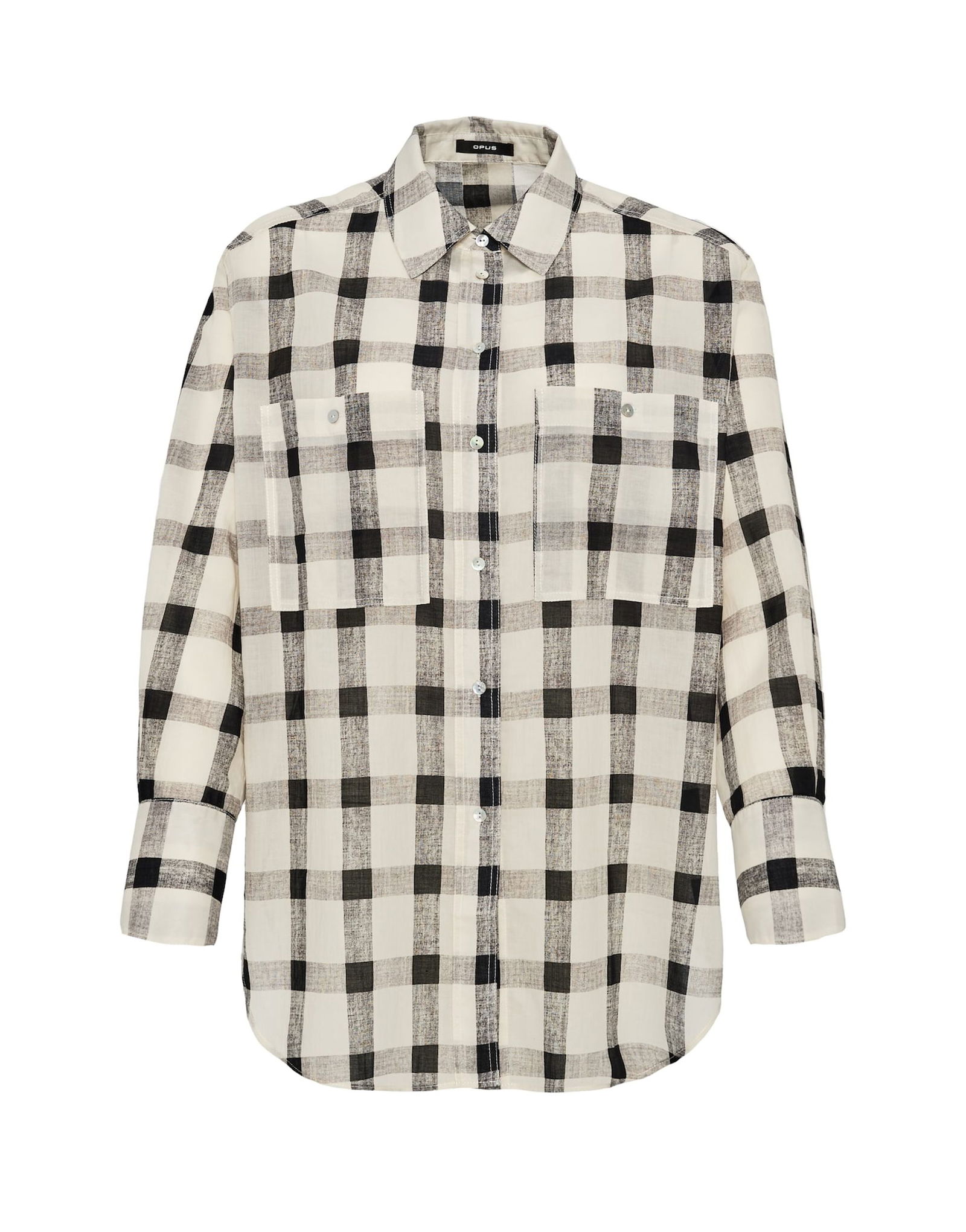 BCI Cotton, kariert, leicht transparent, lange Knopfleiste, Oversize, Langarm lässig krempelbar, aufgesetzte Taschen auf der Brust, abgerundeter Saum mit Schlitzen in den Seiten, hinten länger als vorne, das Model ist 176 cm groß und trägt Größe 36