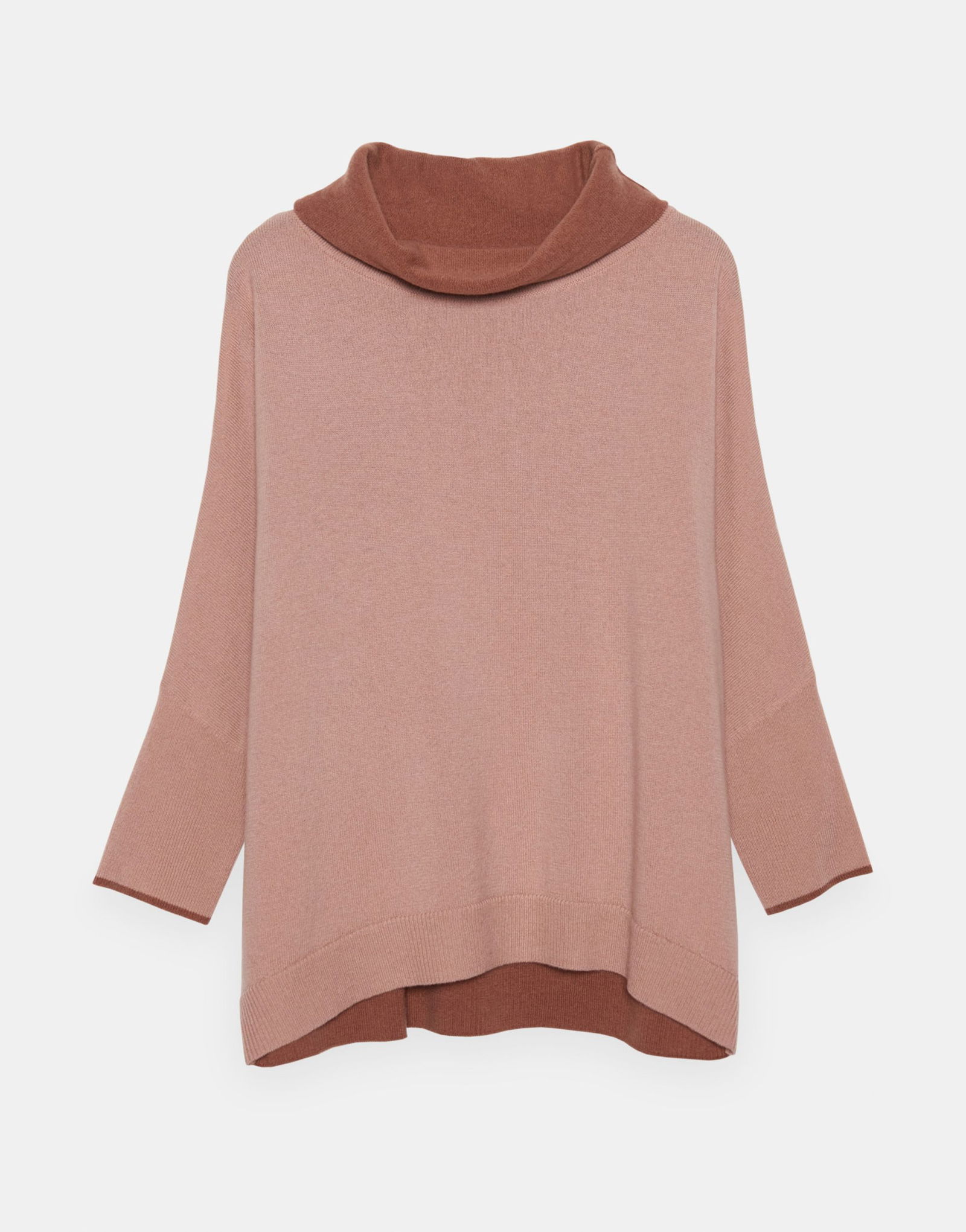 Kaschmir-Mix, extrem soft, Eggshape, breiter, doppelter Rollkragen, Colorblock vorne und hinten, kleiner, angesetzter ¾ Arm, das Model ist 178 cm groß und trägt Größe 36