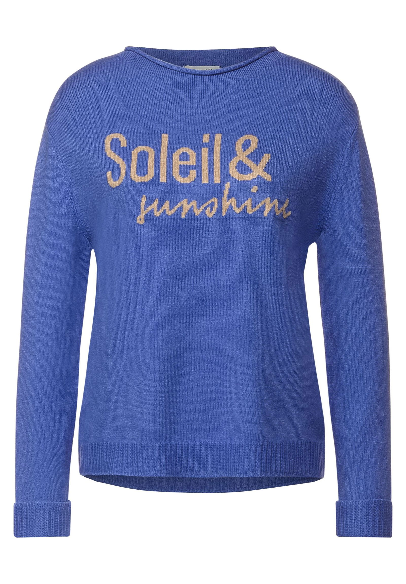 Soleil and sunshine! Locker geschnittener Damen Strickpullover von Street One, der sich mit überschnittenen Schultern von seiner lässigen Seite zeigt. Der Wordingprint auf der Vorderseite sorgt für gute Laune. Ein softer Stehkragen schmeichelt dem Hals und Rippbündchen sowie umgeschlagene Ärmelbündchen runden den Look cool ab.