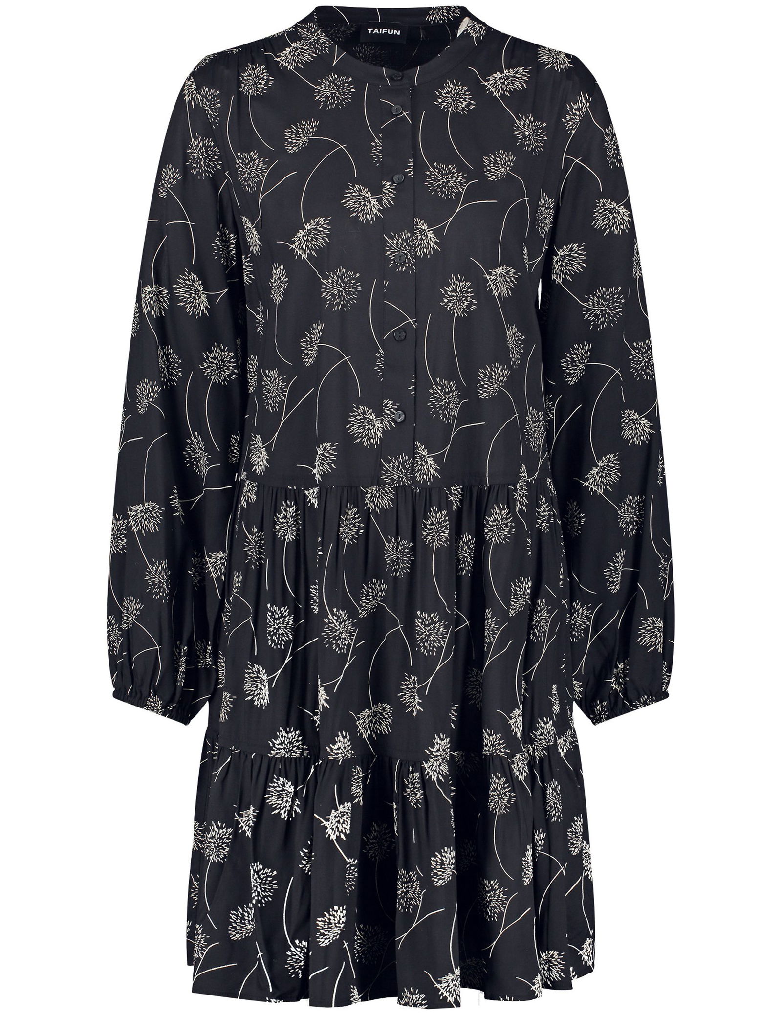 Stufenverarbeitung. Gekräuselte Nähte. Egal ob im Office oder zu formellen Anlässen: Dieses A-Linien-Kleid mit Allover-Print ist ein echter Hingucker. Das nachhaltige Material sorgt für ein angenehmes Tragefeeling. Eine halbe Knopfleiste erleichtert den Einstieg.