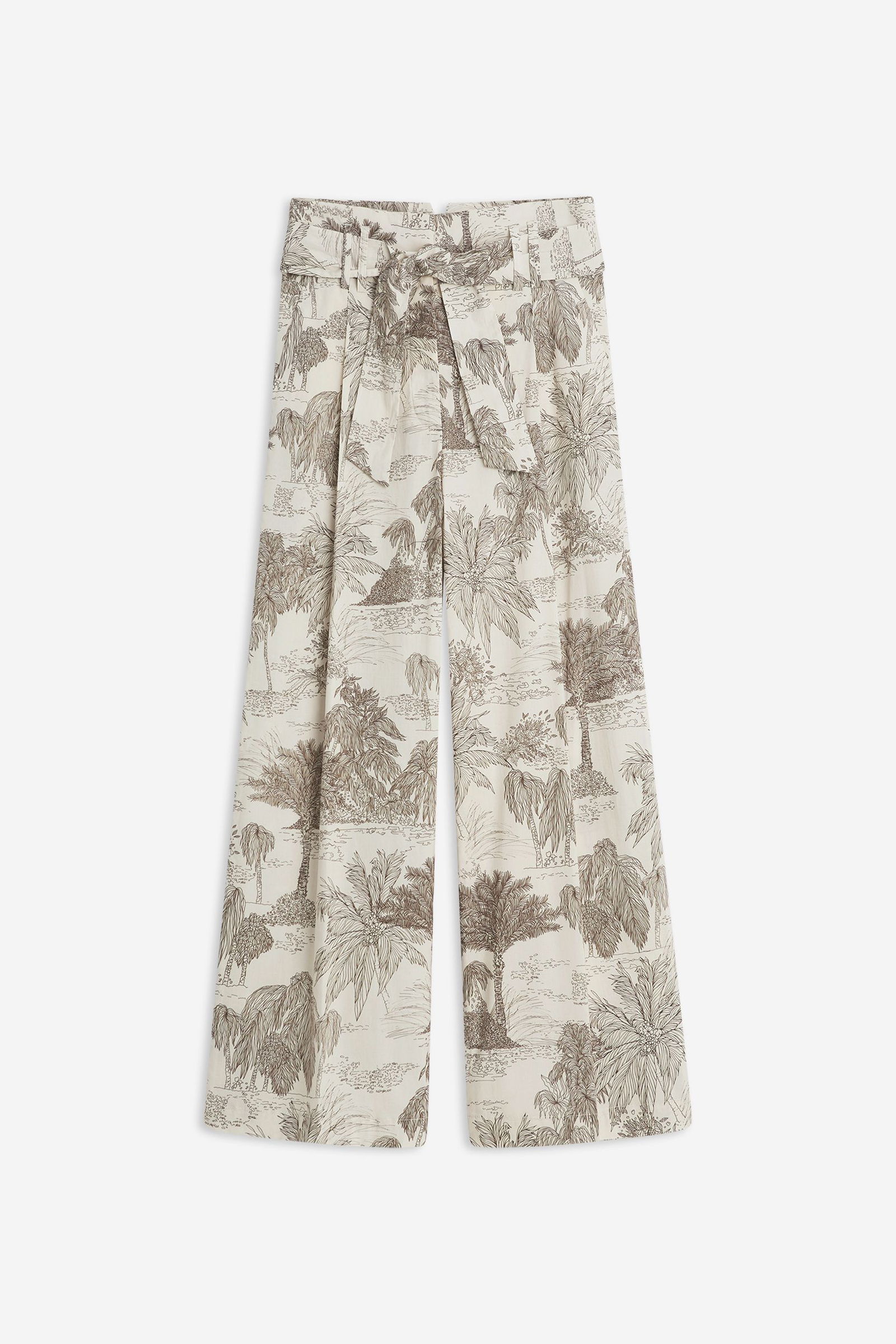 Weit geschnittene, fließende Hose mit sommerlichem Allover-Print. Der elastische Bund sorgt für bequemen Sitz, während das weite Bein und der leichte Stoff eine luftige Silhouette schaffen ideal für warme Tage und lässige City-Looks.