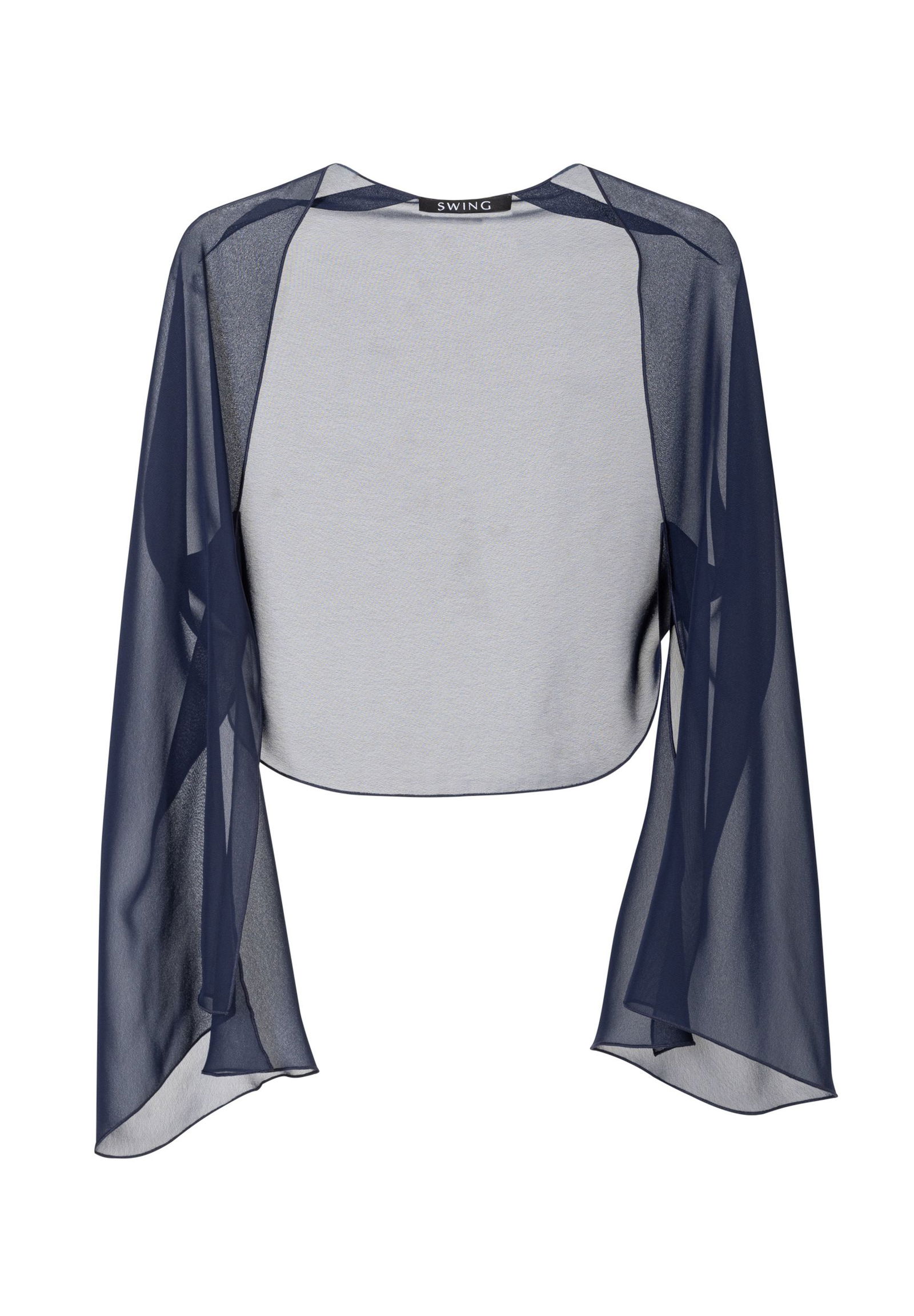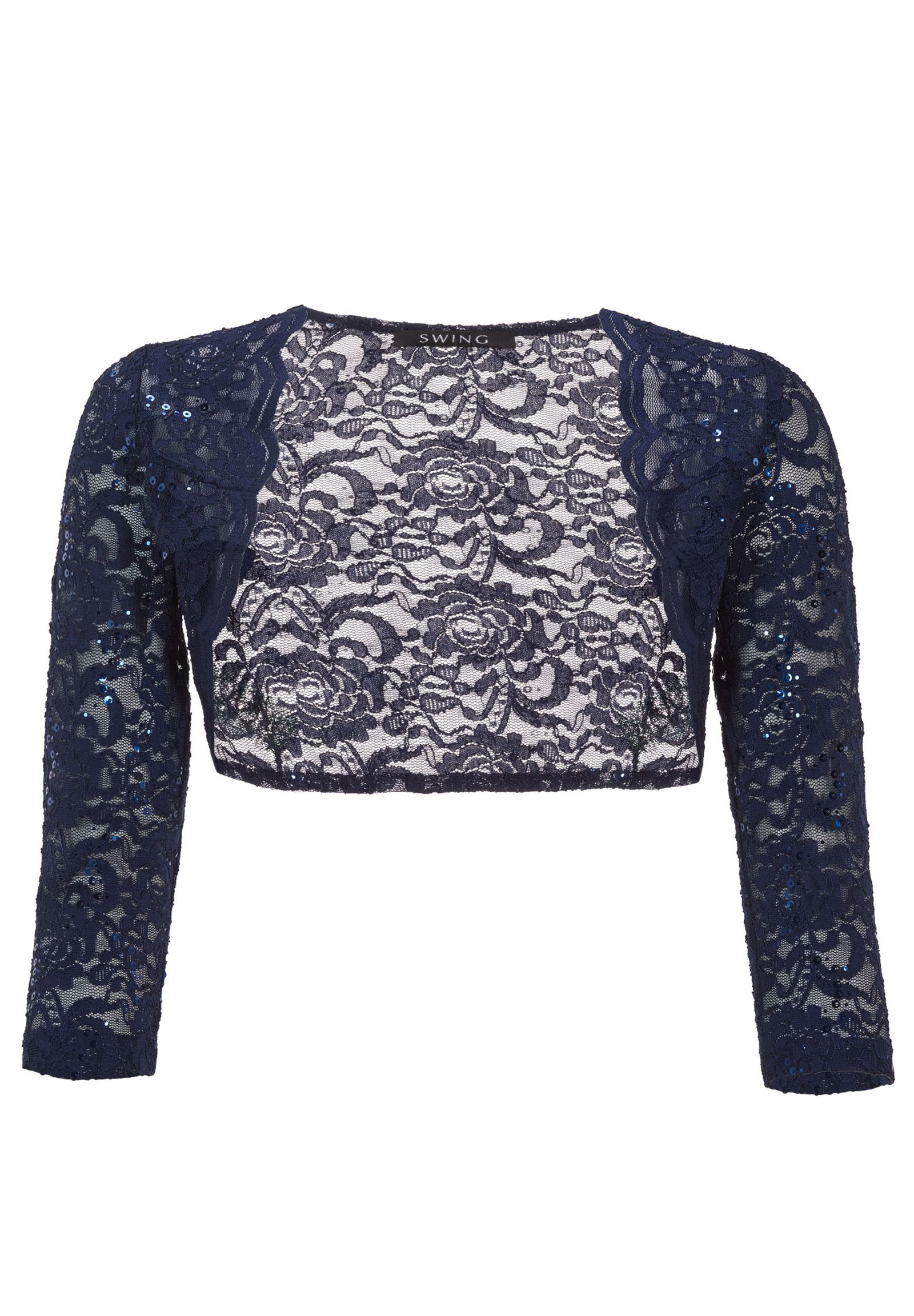 Der Bolero von SWING ist aus Jersey gefertigt und schmal geschnitten. Er zeigt sich mit offener Vorderseite und Dreiviertelärmeln.