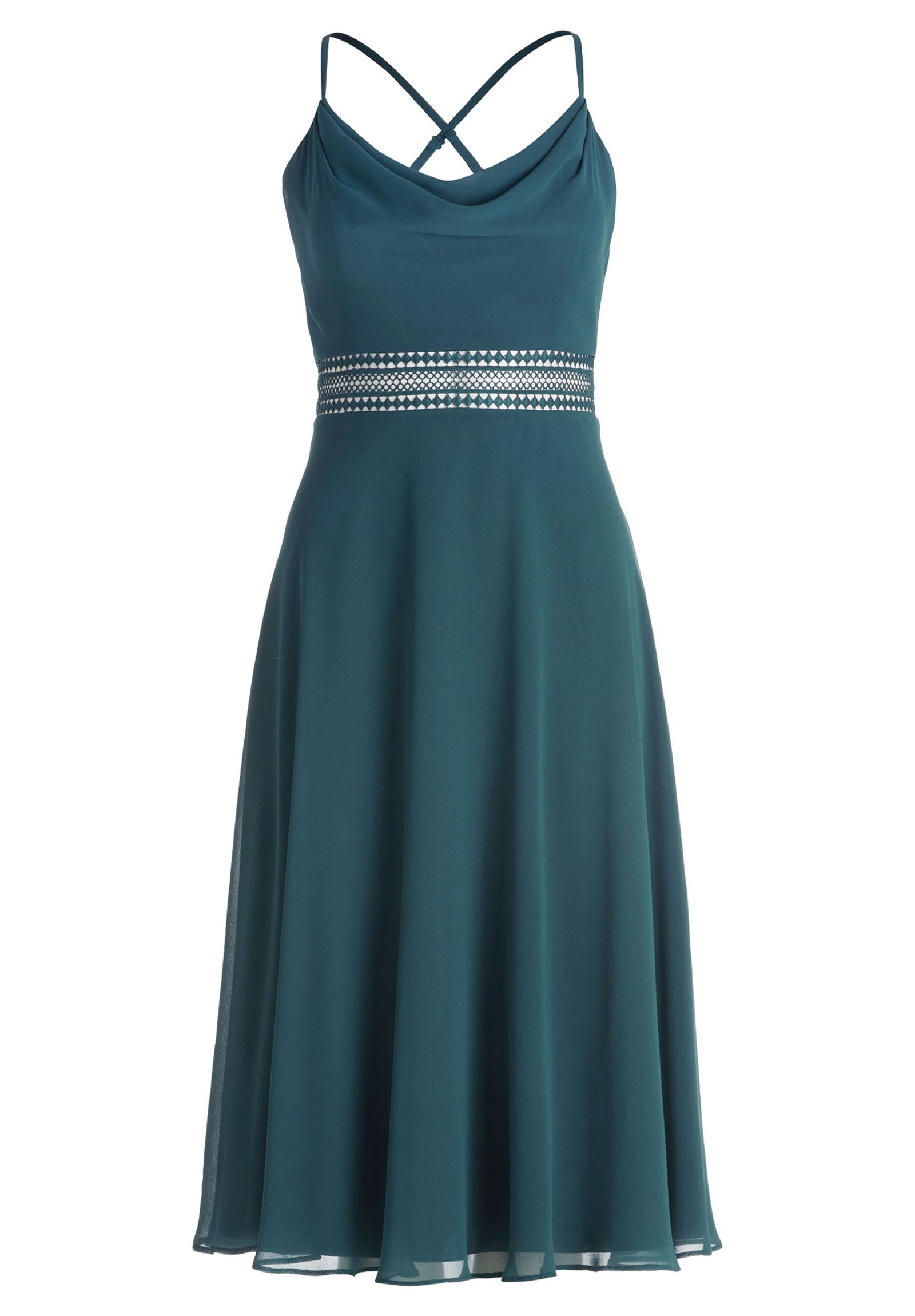 * Passform: Tailliert * Gesamtlänge: 116 cm * Länge ab Taille: 74 cm * Ärmel: Ärmellos * Ausschnittform: Wasserfall-Ausschnitt * Längeninfo: Midi * Materialart: Chiffon * Trägerart: Verstellbare Träger, Spaghettiträger * Verschluss: Reißverschluss * Muster: Uni