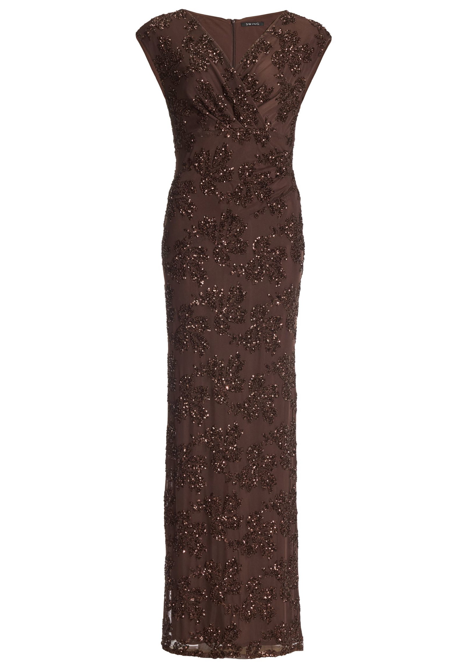 Das SWING Abendkleid aus Chiffon mit paillettenbesetztem Spitzenoberteil verkörpert pure Eleganz und Raffinesse, ideal für festliche Anlässe, bei denen ein glamouröser Auftritt gefragt ist. Dieses atemberaubende Kleid kombiniert die Leichtigkeit von fließendem Chiffon mit der opulenten Ausstrahlung eines kunstvoll gestalteten Spitzenoberteils, das mit funkelnden Pailletten besetzt ist. Der zarte Schimmer der Pailletten verleiht dem Kleid eine luxuriöse Note, die das Licht auf magische Weise einfängt und für einen unvergleichlich festlichen Look sorgt. Das Spitzenoberteil liegt angenehm am Körper an und betont die weibliche Silhouette mit einer meisterhaften Mischung aus Romantik und moderner Eleganz. Der weite, weich fallende Rock aus Chiffon sorgt für eine anmutige Bewegung bei jedem Schritt und verleiht dem Kleid eine schwerelose Leichtigkeit, die es besonders angenehm zu tragen macht.