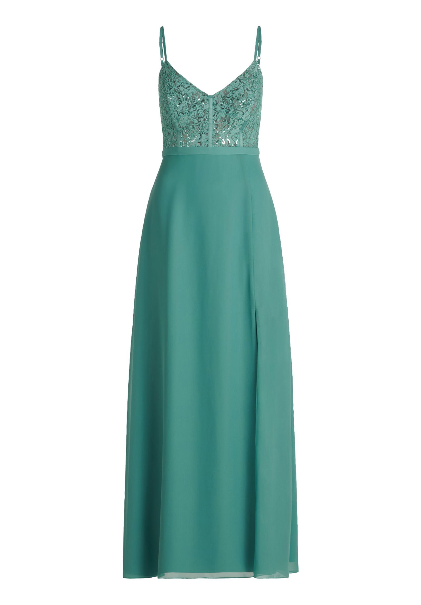 Ein festliches Outfit wird erst durch besondere Details zu etwas Einzigartigem. Funkelnde Pailletten und filigrane Spitze verleihen Ihrem Kleid das gewisse Etwas und sorgen für einen glamourösen Auftritt. Transparente Einsätze setzen einen Hauch von Raffinesse, während raffinierte Rückenausschnitte alle Blicke auf sich ziehen. Beinschlitze sorgen für eine elegante und zugleich verführerische Optik, die Ihr Erscheinungsbild perfekt abrundet.
