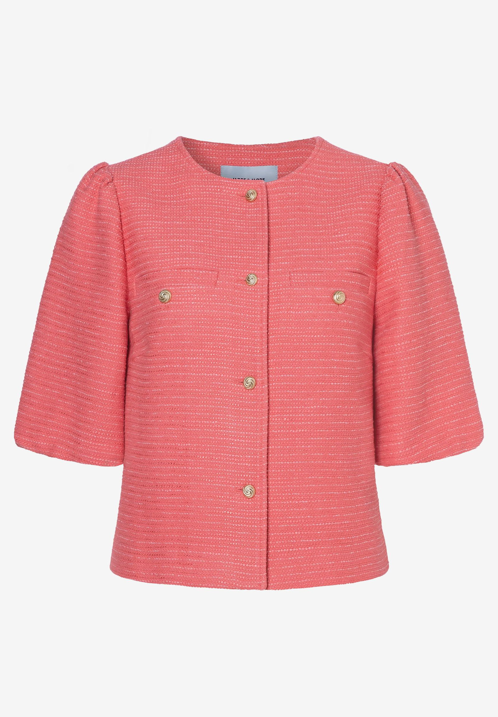 Die kurze Blazerjacke von MORE & MORE mit 3/4 langen Ärmeln ist ein stilvoller Begleiter für vielseitige Office- und Freizeitlooks. Sie kann mit passender Marlenehose zu einem sommerlichen Business-Outfit kombiniert werden, funktioniert aber genauso gut mit lässiger Jeans oder zu femininen Kleidern und Röcken.