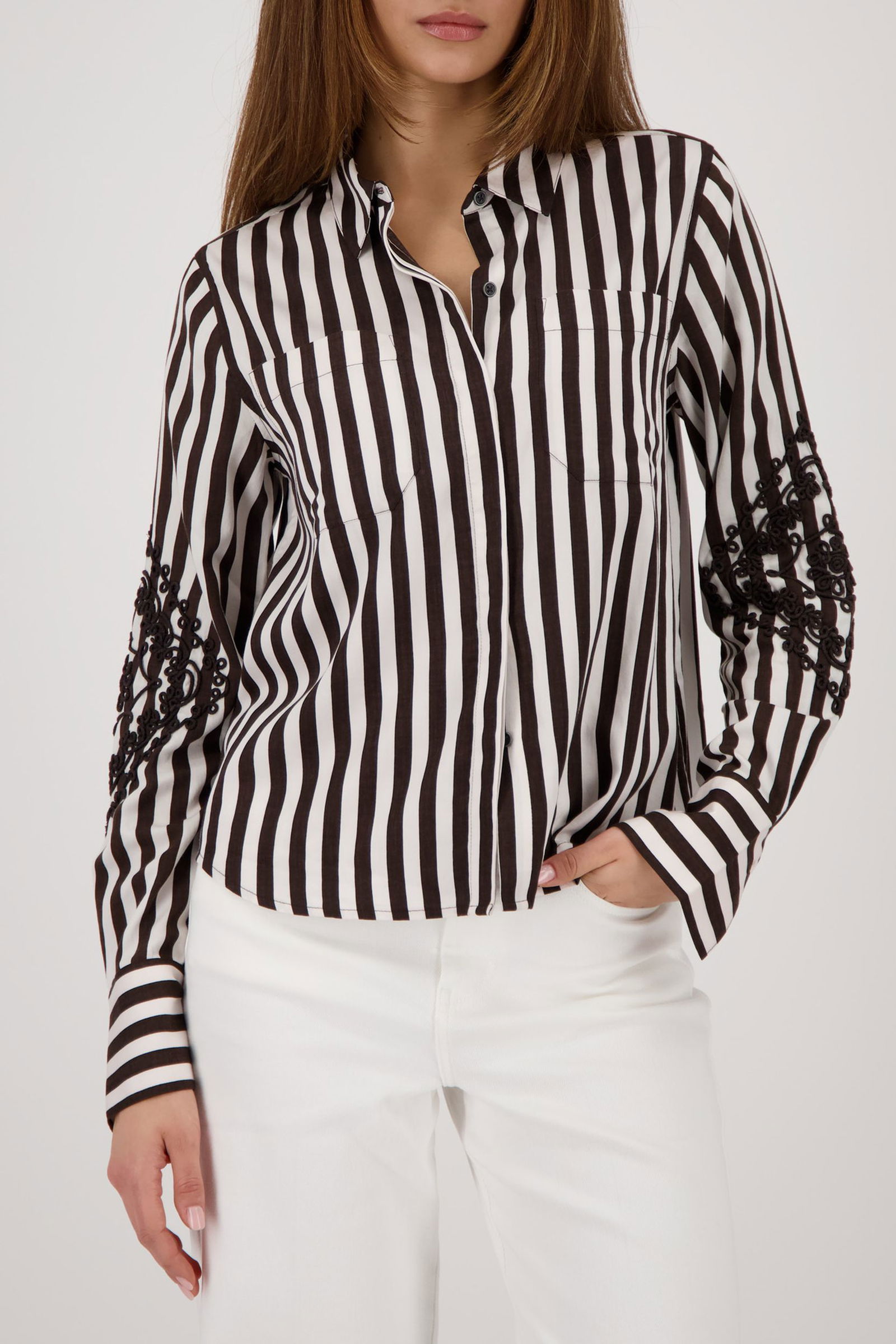 Elegante Bluse aus einer hochwertigen Baumwolle und Modal mit Streifen, Kordelstickerei und abgerundetem Saum – modern und stilvoll.