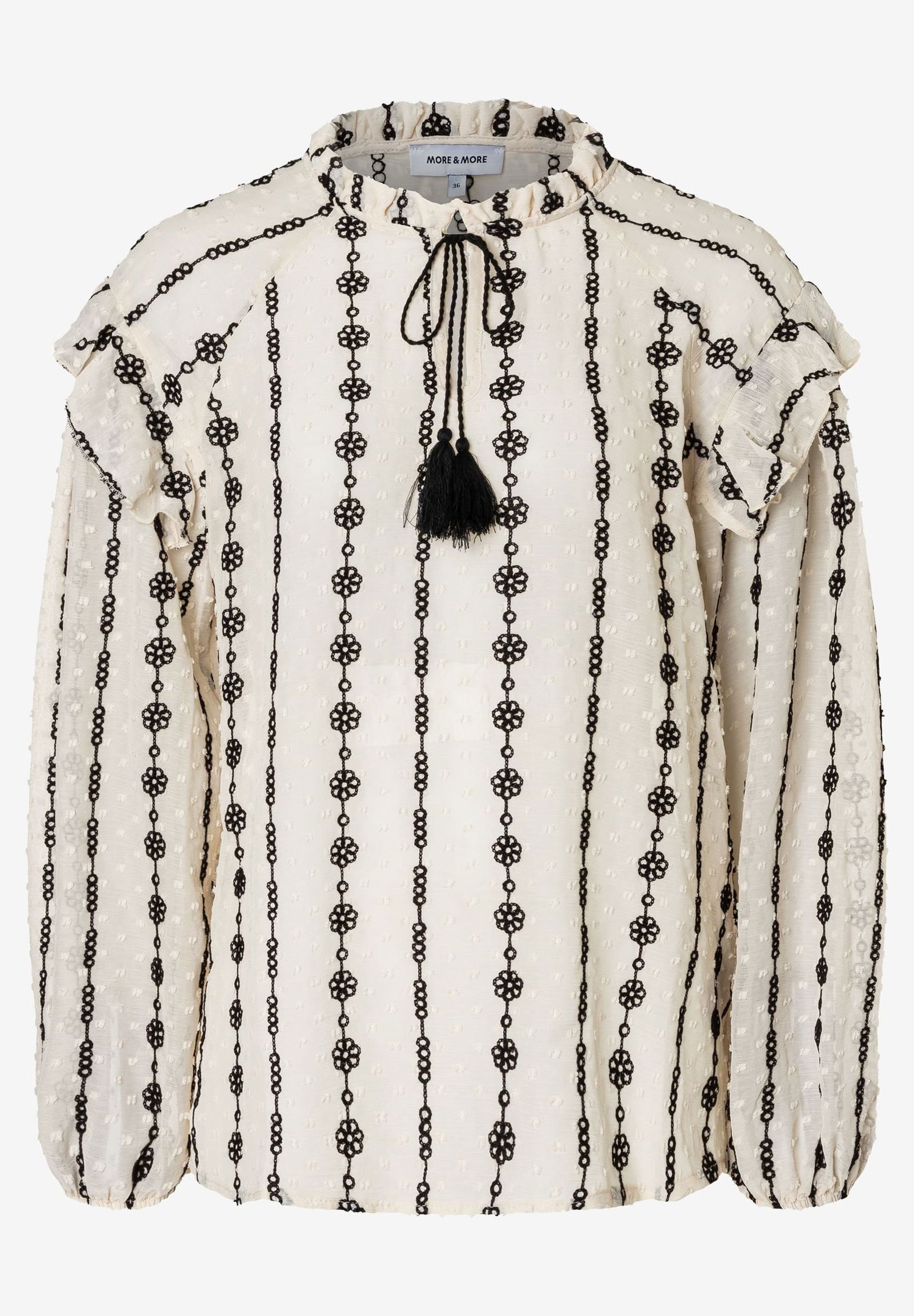 Die feminine Chiffonbluse von MORE & MORE begeistert mit liebevollen Details und bietet dank der lockeren Passform ein angenehmes Tragegefühl. Verspielte Rüschenkanten an Ärmel und Auschnitt setzen romatische Akzente, während die Kordel am Auschnitt mit dekorativen Tasseln für einen Hauch Boho-Flair sorgt. Die fließende Chiffonqualität mit kontrastfarbiger Stickerei verleihen der Bluse einen sehr edlen Look - perfekt für einen stilvollen Auftritt.