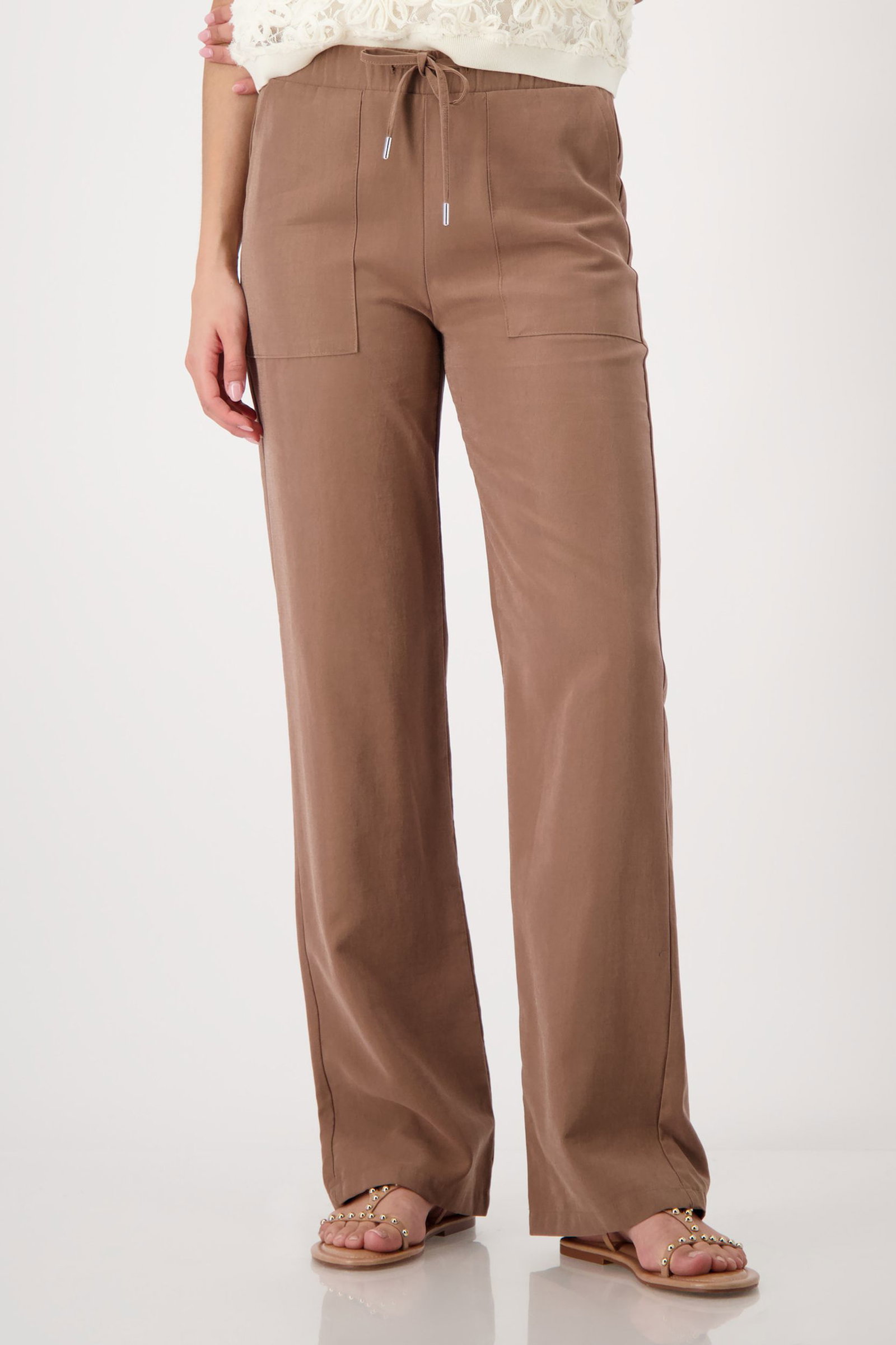 gerader Beinverlauf, Hosenbein Innenlänge ca. 68 cm in jeder Größe, Model Größe 177 cm – trägt Größe 36, Webware, dezente Twillstruktur, weicher Griff, fließender Fall, schräge Eingrifftaschen, Zier-Paspeltasche hinten, abgesteppte Biese vorne, verdeckter Zip-Fly, Gummibund hinten