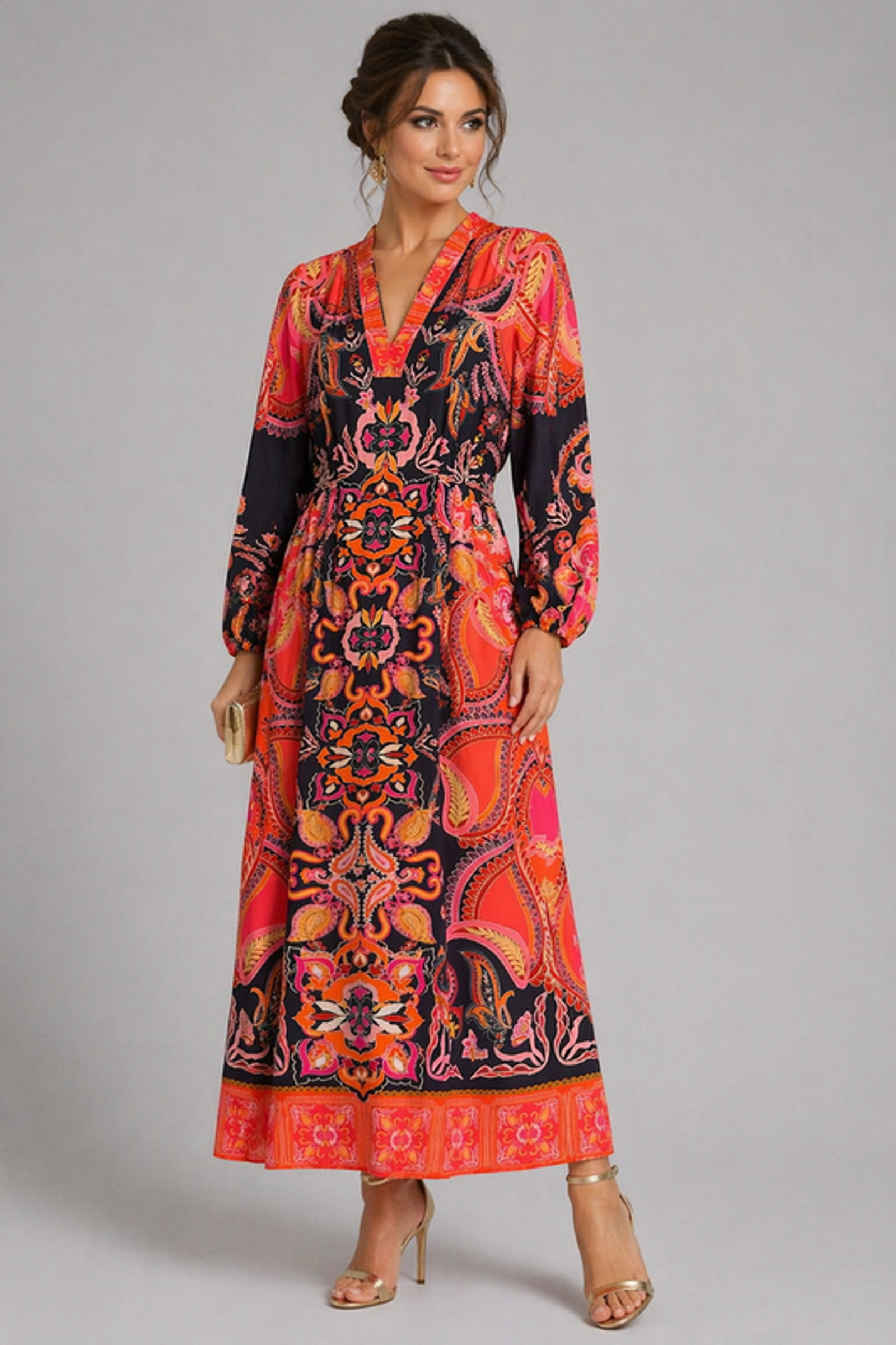 Dieses feminine Maxikleid von FOX´S setzt mit seinem kunstvollen Ornament-Print in kräftigen Rot-, Pink- und Orangetönen auf schwarzem Fond ein echtes Fashion-Statement. Die fließende Qualität sorgt für eine elegante Silhouette und ein angenehmes Tragegefühl – perfekt für besondere Anlässe oder stilvolle Sommerabende. Der schmeichelnde V-Ausschnitt mit dekorativer Blende betont das Dekolleté, während die leicht geraffte Taille eine feminine Form zaubert. Die langen Ärmel mit elastischem Abschluss verleihen dem Kleid eine edle Note und runden das Design harmonisch ab. Die knöchellange Passform unterstreicht die elegante Ausstrahlung und sorgt für einen stilvollen Auftritt.