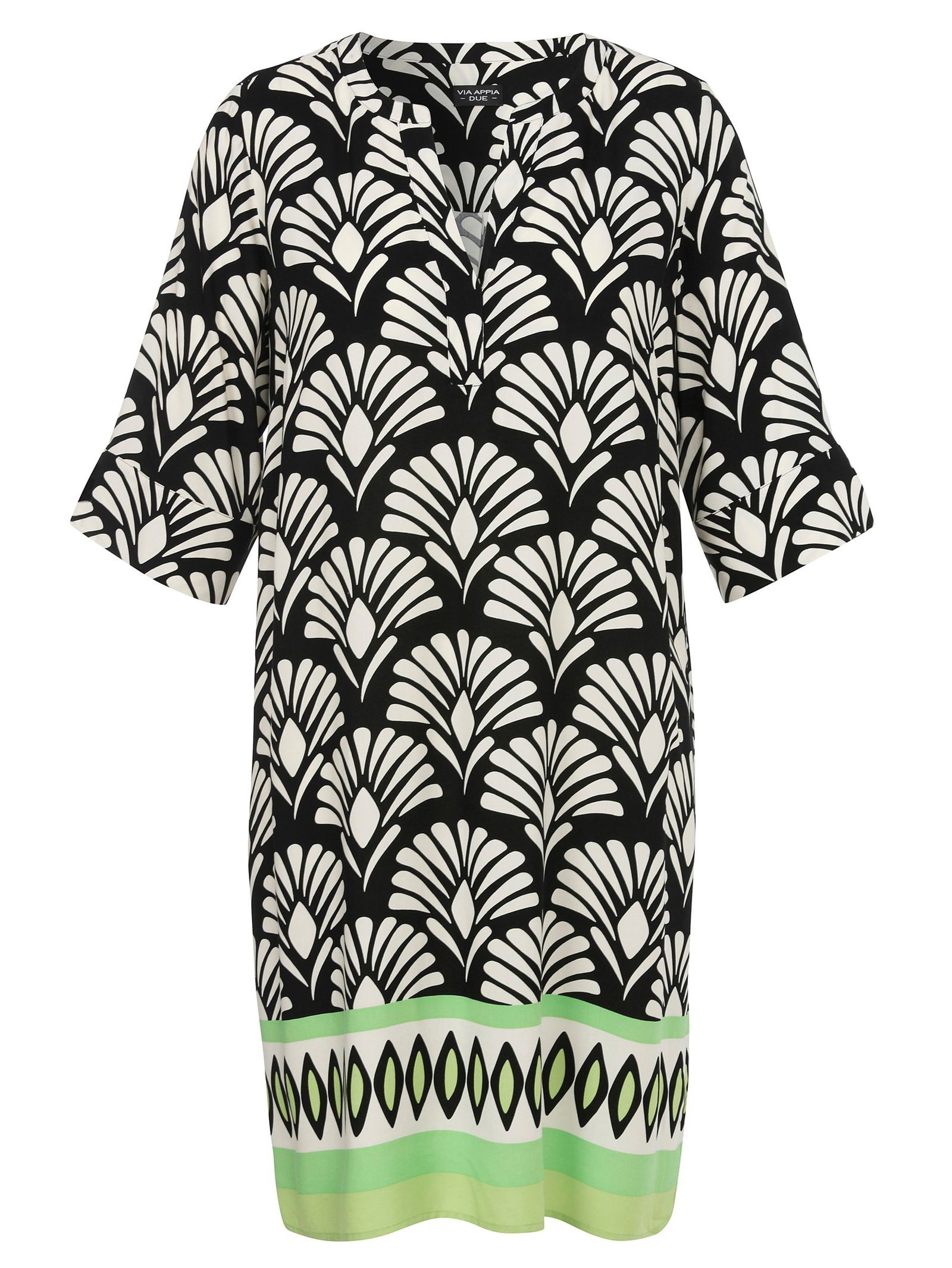 Dieses stilvolle Kleid von FOX´S überzeugt mit einem ausdrucksstarken, grafischen Muster in klassischem Schwarz mit hellen Kontrasten. Der fließende Stoff sorgt für eine feminine Silhouette und einen angenehmen Tragekomfort – ideal für festliche Anlässe und stilvolle Alltagslooks. Der leicht ausgestellte Schnitt in knie- bis knöchellanger Länge verleiht dem Kleid eine elegante Bewegung, während der offene V-Ausschnitt mit kleinem Kragen dem Design eine moderne Note gibt. Die 3/4-Ärmel runden den Look harmonisch ab und machen das Modell vielseitig kombinierbar.