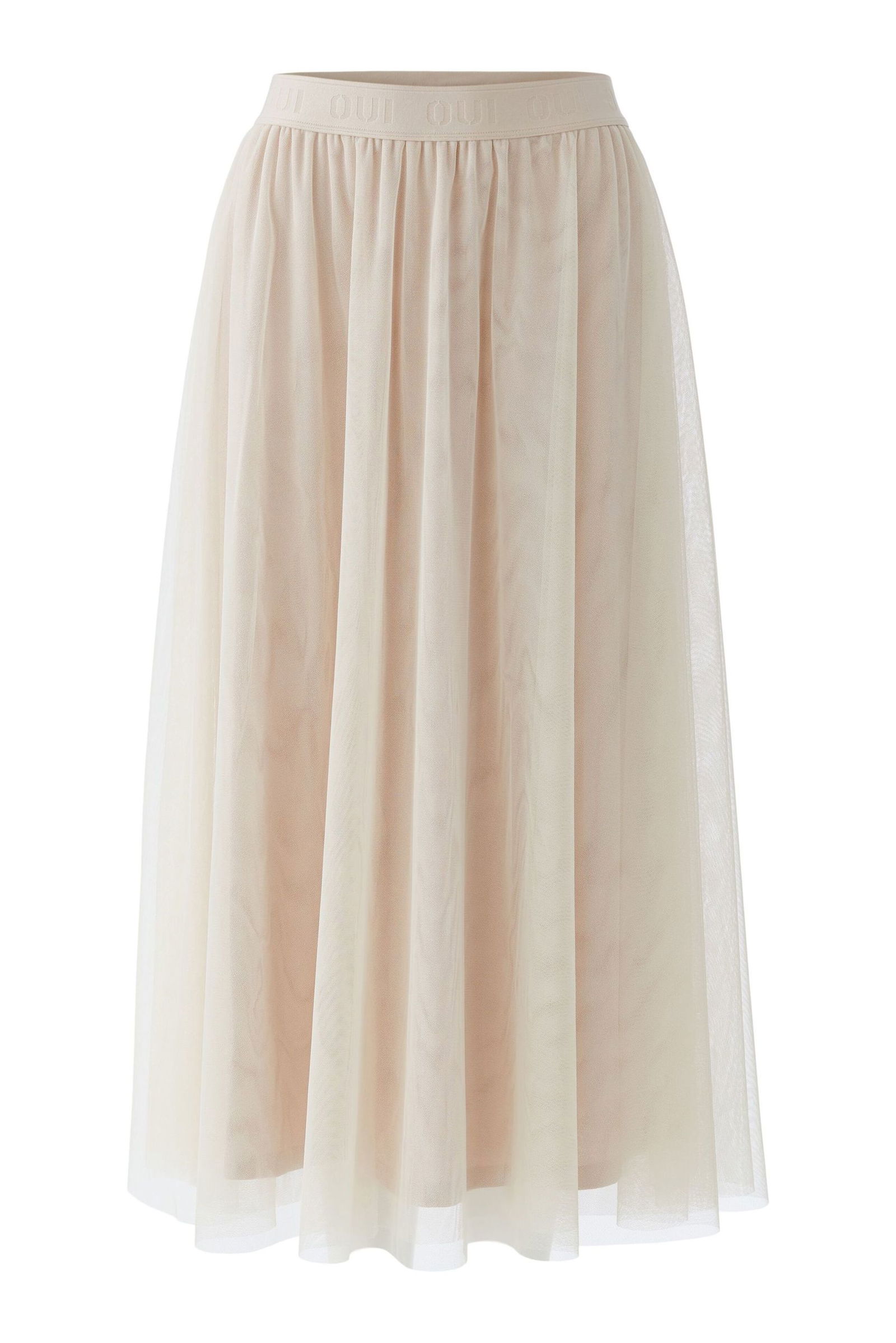 Transparenter Tüll A-Shape, Maxi-Länge, mid rise Gummibund mit Oui Logo Jacquard zum Schlupfen Mit elastischem Jerseyfutter: Viskose mit reichlich Glanzgarn Die beiden Lagen sind tonig abgestimmt * Länge bei Größe 36: 86cm