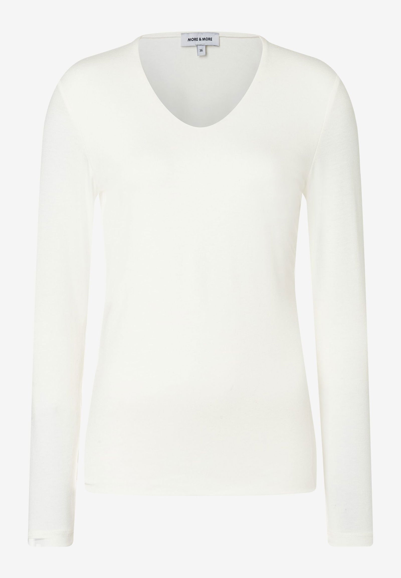 Das feminine Langarmshirt von MORE & MORE mit abgerundetem V-Ausschnitt und gedoppelter Front ist ein toller Allrounder, der sich sehr vielseitig kombinieren lässt und in keinem Kleiderschrank fehlen sollte. Das Shirt kann solo zu Rock oder Hose getragen werden, sieht aber auch unter einem Cardigan oder Blazer sehr gut aus.