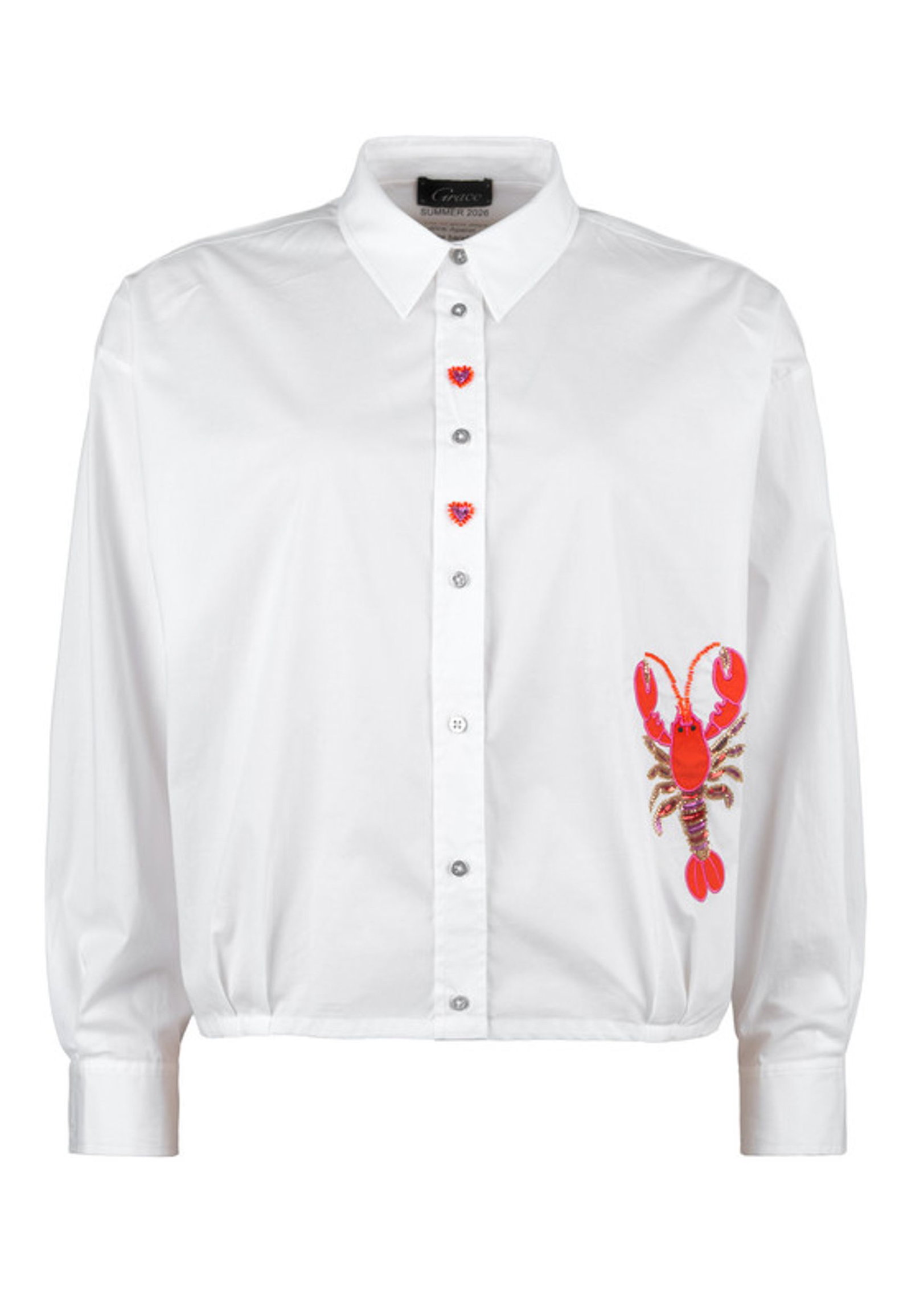Die Grace Hemdbluse vereint klassische Eleganz mit funkelnden Details. Der gerade Schnitt sorgt für eine zeitlose, bequeme Passform, während der klassische Hemdblusenkragen und die durchgehende Knopfleiste dem Design eine stilvolle Note verleihen. Lange Ärmel mit Einknopf-Manschetten unterstreichen den klassischen Look und bieten vielseitige Stylingmöglichkeiten. Die breite Rückenpasse sorgt für eine optimale Passform und angenehme Bewegungsfreiheit. Gefertigt aus hochwertiger Baumwolle mit elastischer Qualität überzeugt die Bluse durch ihre glatte Haptik und hohen Tragekomfort. Ein dekorativer Motiv-Print wird durch funkelnde Pailletten und edle Schmucksteine akzentuiert und macht die Bluse zu einem besonderen Hingucker.