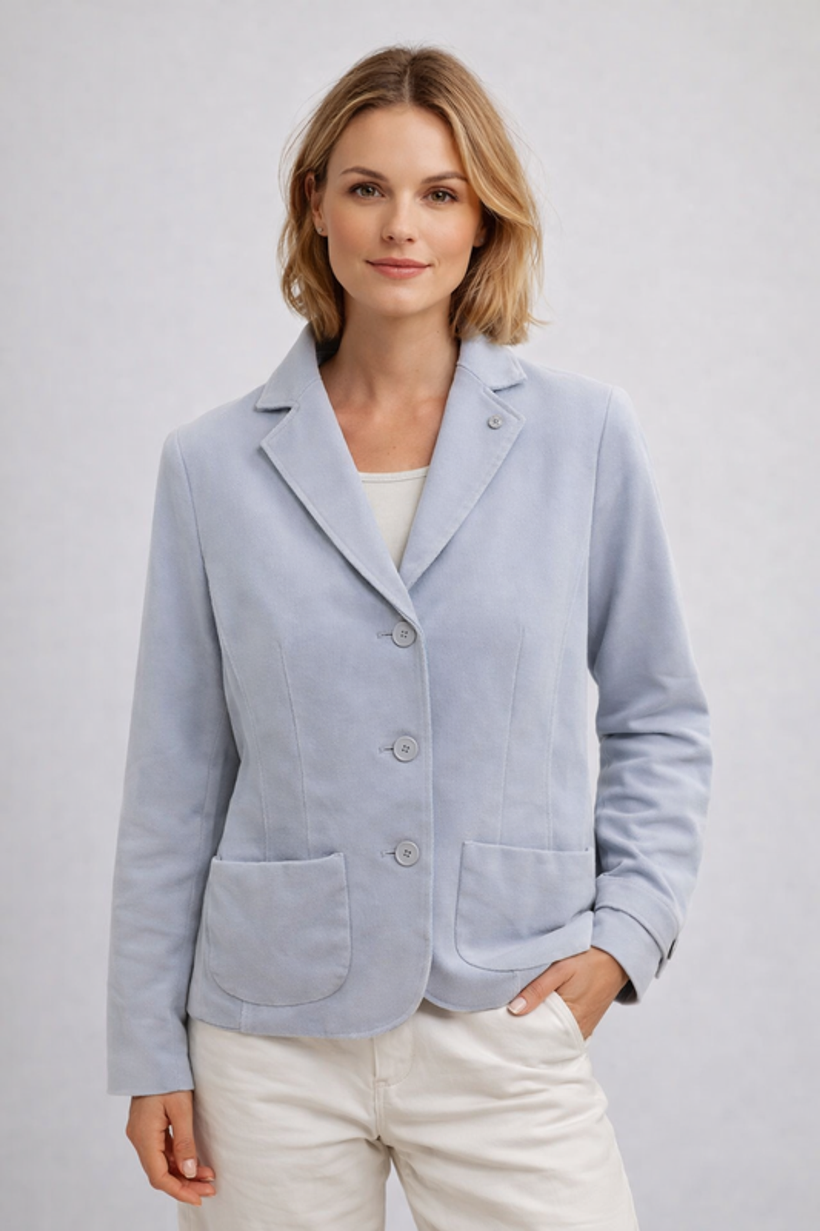Der Blazer „SAVAUDE“ von Blonde No.8 ist ein modernes Essential für die milde Jahreszeit. Mit seiner leichten Verarbeitung und der klaren, femininen Silhouette vereint er sommerliche Eleganz mit lässigem Komfort. Die sanften, frischen Farbtöne unterstreichen den luftigen Charakter und machen ihn zum idealen Begleiter für sonnige Tage. Der klassische Reverskragen und die dezente Knopfleiste verleihen dem Blazer eine zeitlose Optik, während aufgesetzte Taschen für eine entspannte, moderne Note sorgen. Das leichte Material bietet ein angenehm luftiges Tragegefühl – perfekt für warme Temperaturen. Ob im Alltag, im Office oder auf Reisen: „SAVAUDE“ lässt sich vielseitig kombinieren und passt sowohl zu casual Looks mit Shorts und Tops als auch zu femininen Outfits mit Kleidern oder modernen Denim-Styles.