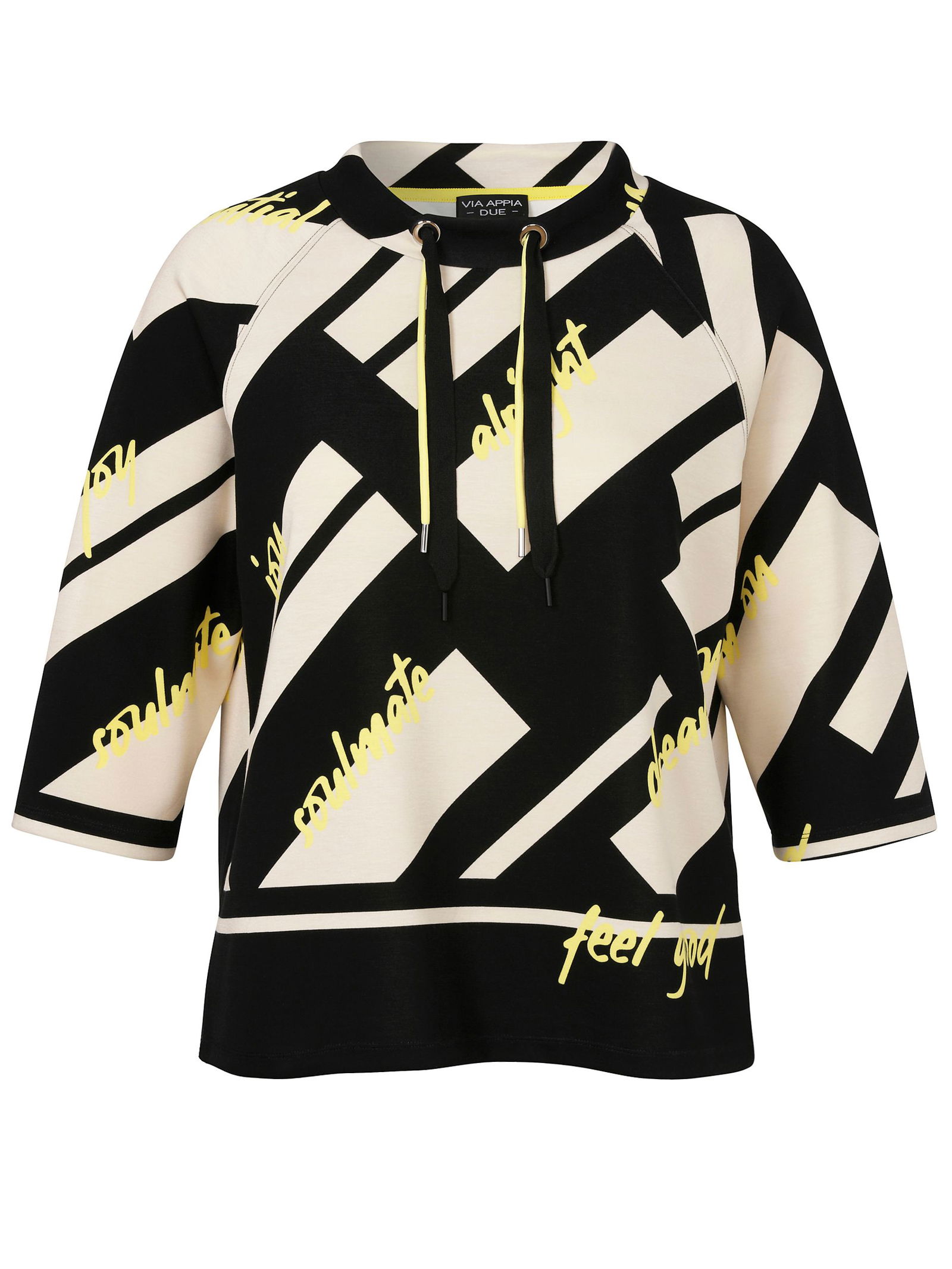 Die Bluse von Doris Streich besticht durch ihren dekorativ cleanen Wording-Print GO FOR IT. Das weiche Viskose-Material, die fließende Passform mit Weite gebender Falte im Rückenteil und angesagter HighLow-Form mit verlängerter Rückenpartie umspielen Ihre Figur perfekt. Sehr dekorativ sind die Strass-Steinchen oben an der Knopfblende. Die 3/4-Ärmel lassen sich verstellen, ob hochgerafft oder hochgekrempelt, mit den Strass-verzierten Laschen am Ärmel zu fixieren. Alloverprint, nicht latziert- jedes Teil ein Unikat.