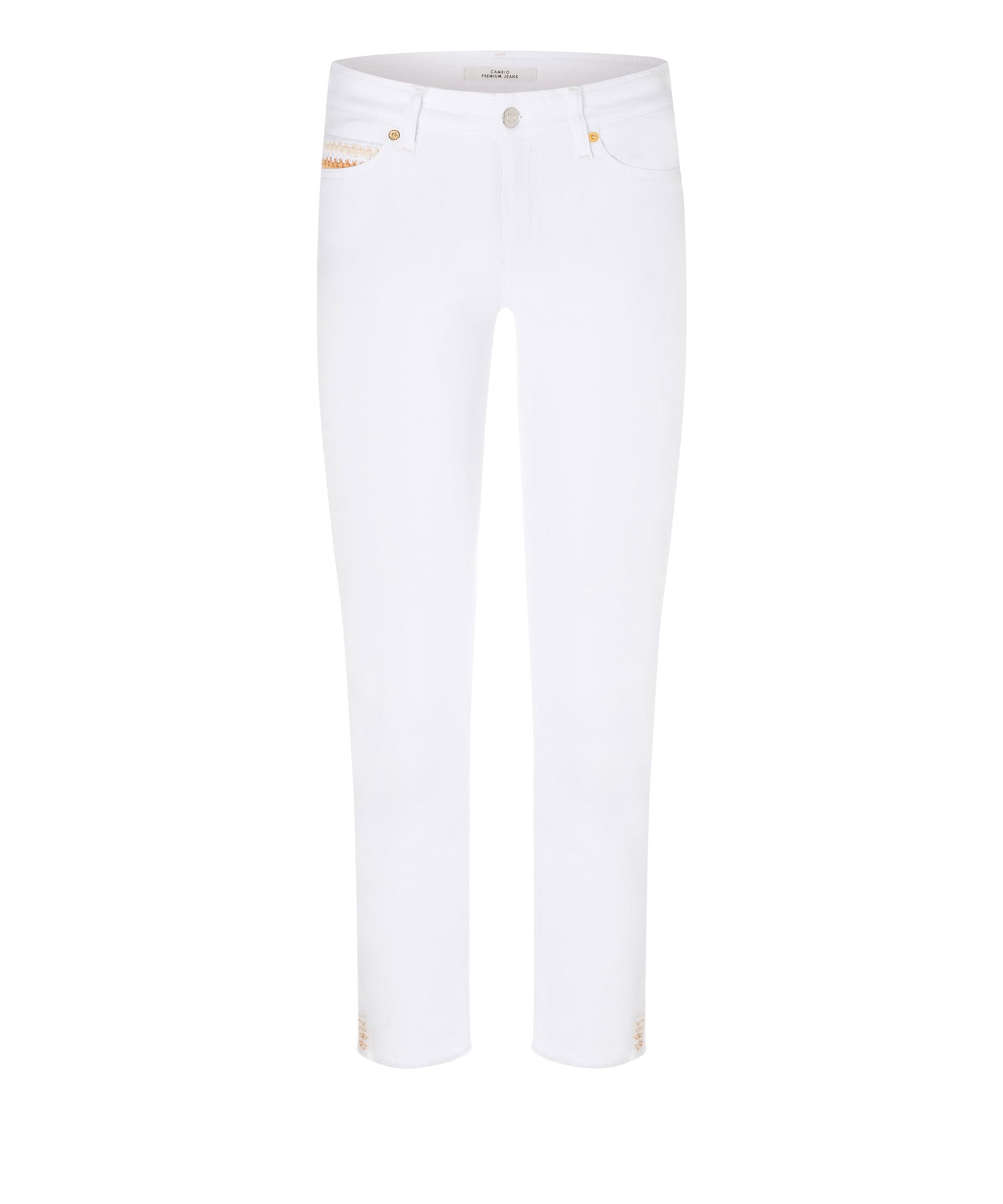 Die Cambio Jeans "Elia" präsentiert sich im klassischen 5-Pocket-Stil und überzeugt mit einer modernen, leicht verkürzten Silhouette. Das Modell zeigt eine authentische Denim-Waschung mit dezenten Used-Effekten, die der Jeans eine lässige, zugleich hochwertige Optik verleihen. Charakteristische Ziernähte und eine Nahtführung über dem Knie unterstreichen das sportive Design. Mit ihrem geraden, leicht konischen Bein bietet die Cambio "Elia" eine moderne Passform, die sich vielseitig kombinieren lässt – ideal für einen zeitgemäßen Look mit modischer Ausstrahlung.
