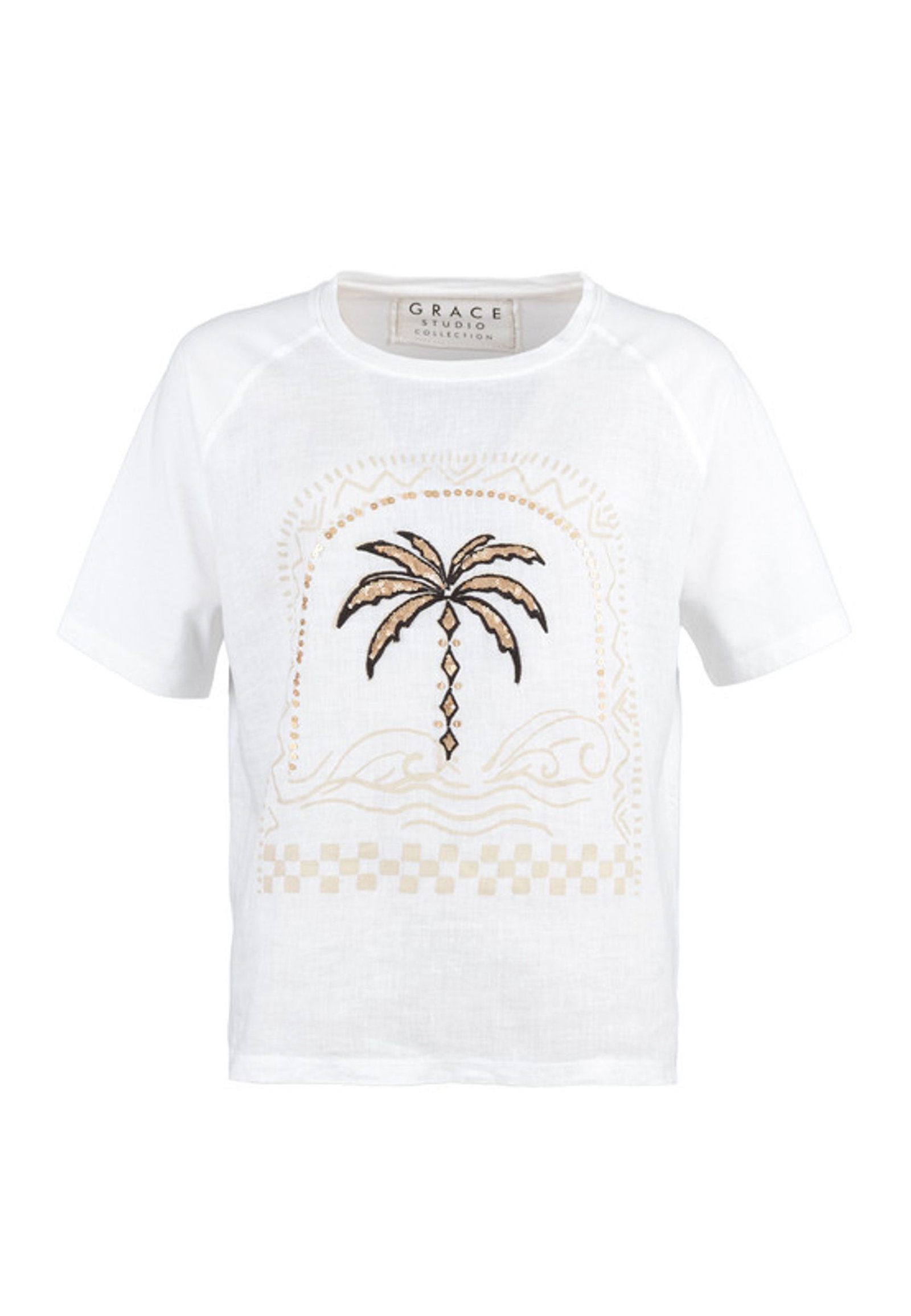 Das Grace T-Shirt vereint lässigen Komfort mit einem Hauch von Glamour. Der gerade Schnitt und die modernen Raglanärmel sorgen für eine entspannte Passform und einen sportlich-eleganten Look. Der klassische Rundhalsausschnitt unterstreicht das zeitlose Design. Gefertigt aus einer hochwertigen Jerseyqualität mit Baumwolle und Leinen, überzeugt das Shirt durch seine angenehm glatte Haptik und ein luftiges Tragegefühl – perfekt für warme Tage. Flachnähte bieten zusätzlichen Komfort und ein besonders angenehmes Hautgefühl. Ein stilvoller Motiv-Print wird durch funkelnde Pailletten akzentuiert und verleiht dem Shirt eine besondere Note, die jedes Outfit aufwertet – ob casual kombiniert oder als modischer Blickfang.