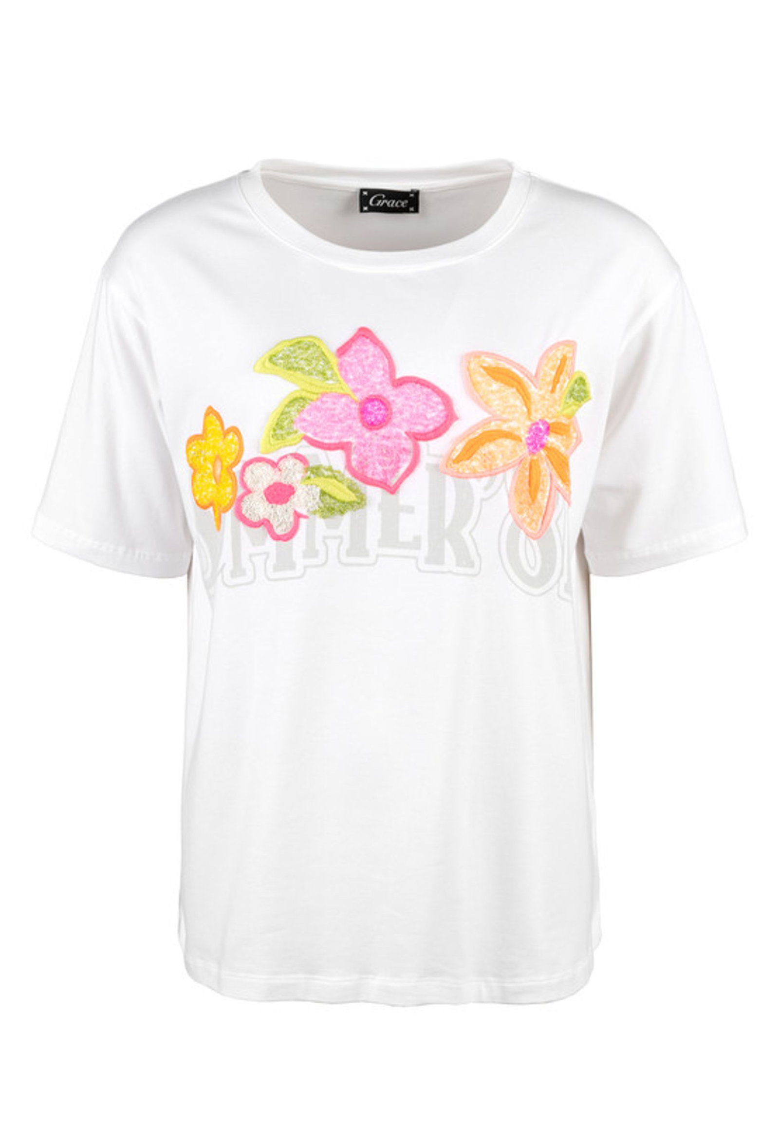 Das Grace T-Shirt vereint lässige Silhouette mit femininen Details. Der weite Schnitt und die kurzen Ärmel sorgen für eine entspannte Passform, während der klassische Rundhalsausschnitt das Design zeitlos abrundet. Die verlängerte Rückenpartie verleiht dem Shirt eine moderne Note und schmeichelt der Figur. Gefertigt aus weicher Baumwolle in angenehmer Jerseyqualität, überzeugt das Modell mit einer glatten und besonders soften Haptik – ideal für den ganzen Tag. Ein platzierter Print wird durch funkelnde Pailletten und feine Stickereien stilvoll in Szene gesetzt und macht das Shirt zu einem modischen Hingucker mit liebevollen Details.