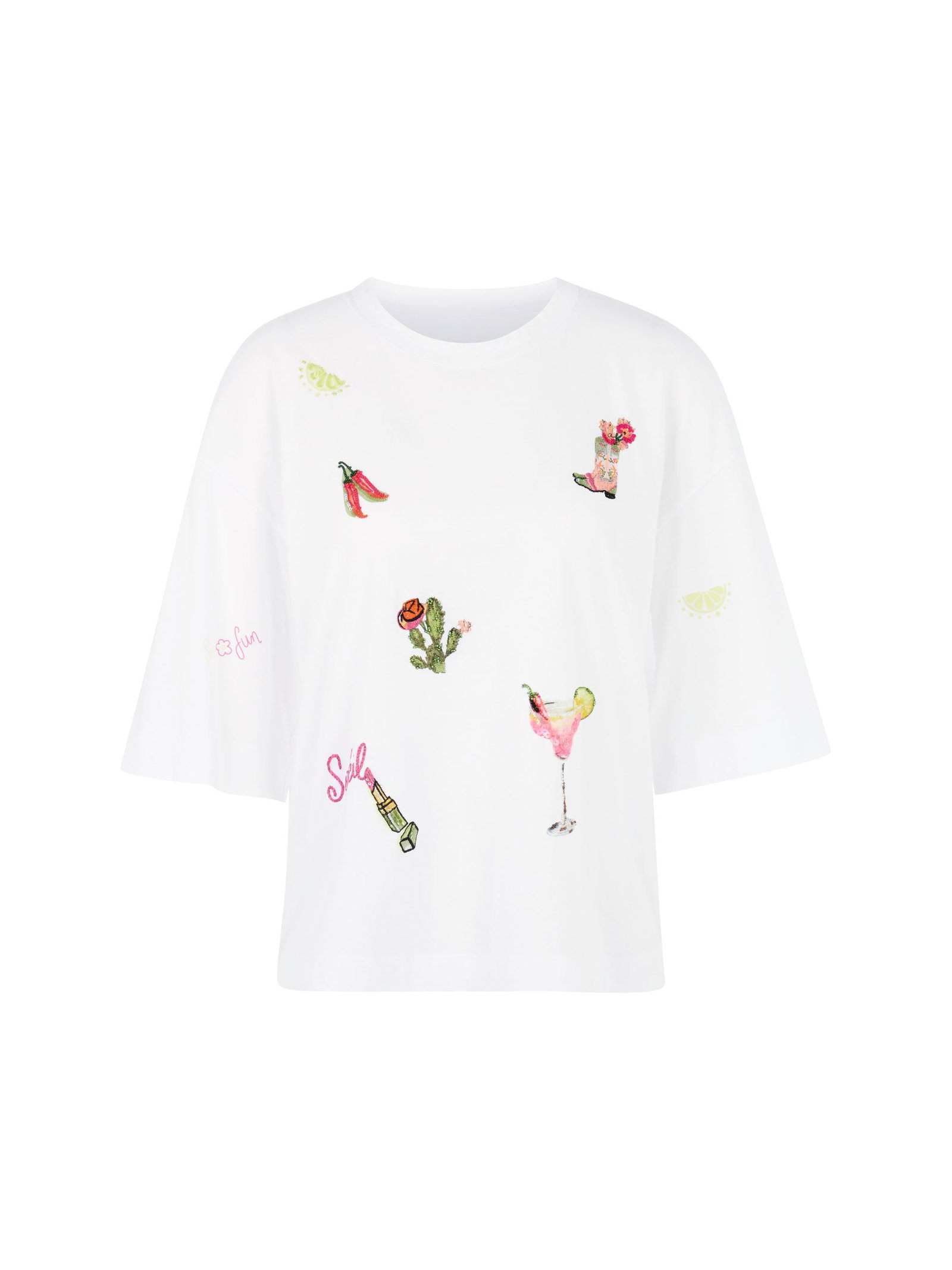 Shirt mit 3/4-Ärmeln und Patches|Locker geschnittenes Shirt mit 3/4-langen und leicht überschnittenen Ärmeln. Die farbfrohe Stickereipatches auf der Vorderseite sind zusätzlich mit Pailletten und Perlen verziert, was dem Shirt eine verspielte Note verleiht. Ideal kombinierbar zu Hosen, Röcken oder Shorts für einen lebendigen Sommer-Look.|Locker geschnitten|Farbenfrohe Stickereipatches|Rundhalsausschnitt|Softer Griff|Das Model ist 179 cm groß und trägt N3/38.