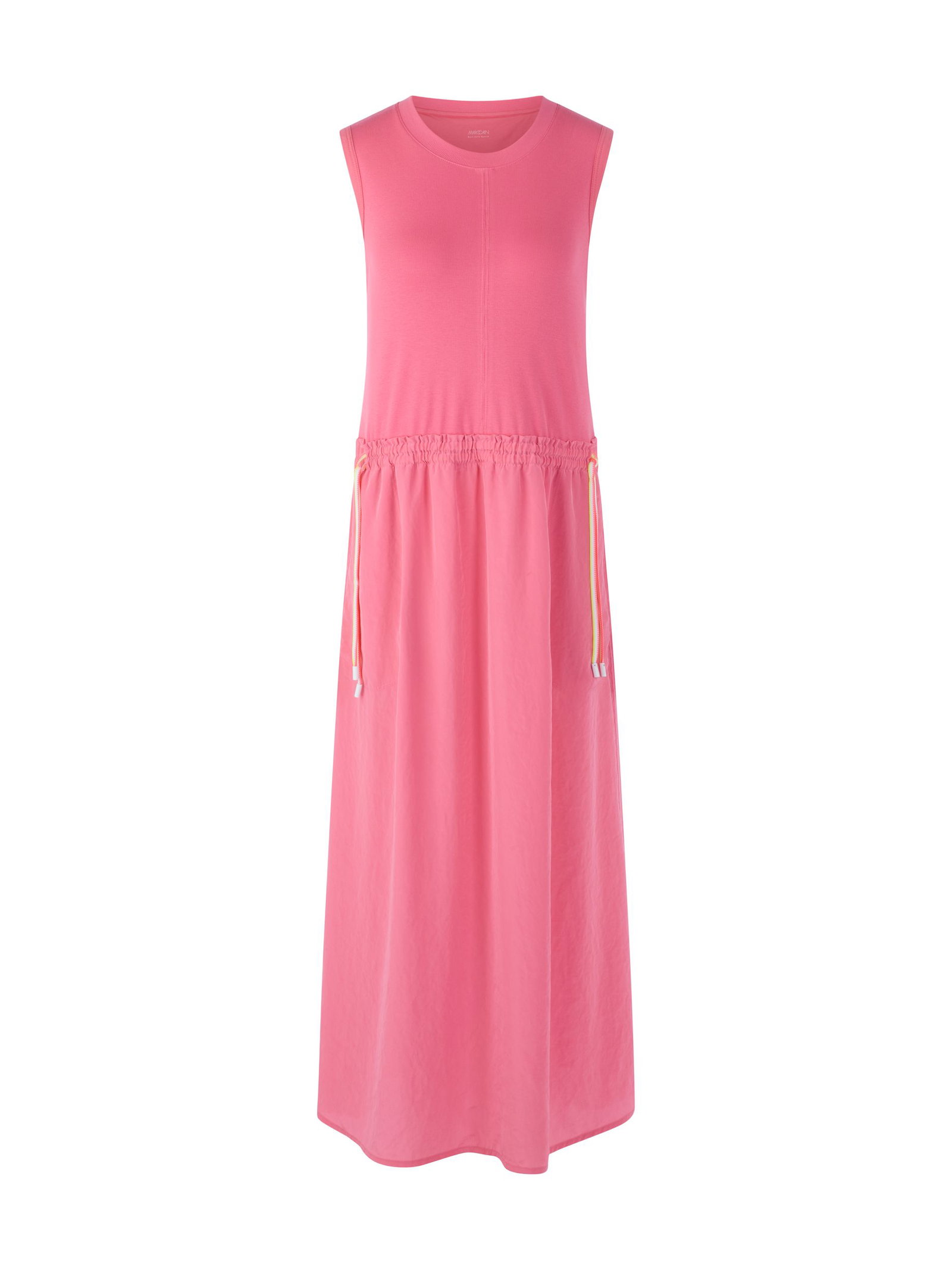 Ärmelloses Midikleid mit Tunnelzug|Ärmelloses Kleid in einer femininen Midilänge. Das Oberteil ist aus einer feinen Rippstrick-Qualität gefertigt und liegt angenehm am Körper. Der Rock besteht aus einer fließenden Webqualität. An der Hüfte ist der Rock abgesetzt und leicht gerafft. Ein Tunnelzug mit farblich abgesetzten Kordeln setzt einen modernen Akzent. Ideal für warme Tage und sommerliche Looks.|Leger geschnitten|Midilänge|Eingriffstaschen am Rock|Weich fließende Qualität|Das Model ist 179 cm groß und trägt N3/38.