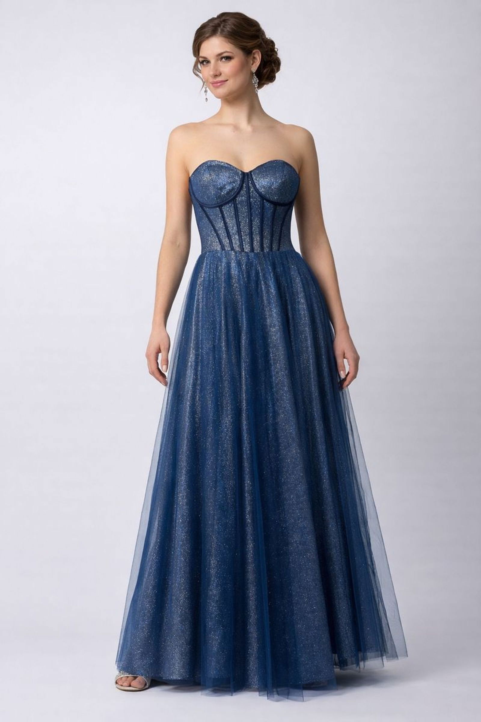 Dieses glamouröse Abendkleid von Mascara London ist ein echter Blickfang und vereint Eleganz mit moderner Raffinesse. Das bodenlange Kleid in edlem Navy-Blau begeistert durch seinen feinen Glanz und die hochwertige Verarbeitung. Das trägerslose Corsagen-Oberteil mit geformten Cups und dekorativen Nähten betont das Dekolleté und formt eine wunderschöne Silhouette. Der schimmernde Tüllrock fällt weich und fließend und sorgt bei jeder Bewegung für einen eleganten Auftritt. Die glitzernde Oberfläche verleiht dem Kleid eine luxuriöse Ausstrahlung und macht es perfekt für besondere Anlässe.