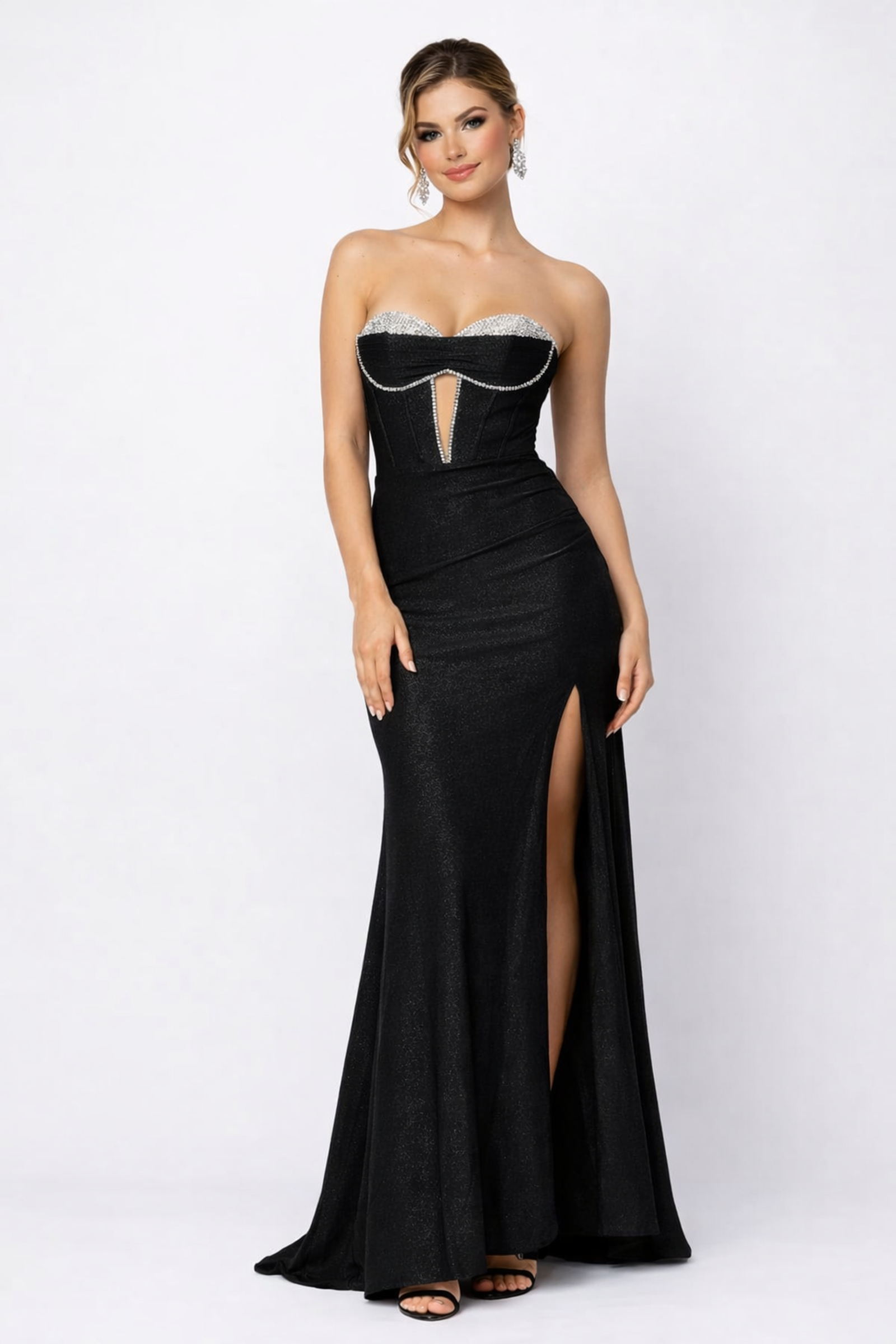 Dieses elegante Abendkleid von Mascara London überzeugt durch seine glamouröse und feminine Ausstrahlung. Das bodenlange Kleid ist in klassischem Schwarz gehalten und leicht schimmernd, was ihm eine besonders edle Optik verleiht. Das trägerslose Bustier-Oberteil ist mit funkelnden Strassdetails verziert und setzt das Dekolleté stilvoll in Szene. Die figurbetonte Schnittführung betont die Silhouette, während der schmale Beinschlitz für einen verführerischen Akzent und angenehme Bewegungsfreiheit sorgt. Abgerundet wird das Design durch die hochwertige Verarbeitung und den fließenden Fall des Stoffes. Dieses Kleid ist die perfekte Wahl für Abendveranstaltungen, Galas, Bälle oder besondere Anlässe, bei denen ein eleganter und stilvoller Auftritt gefragt ist.