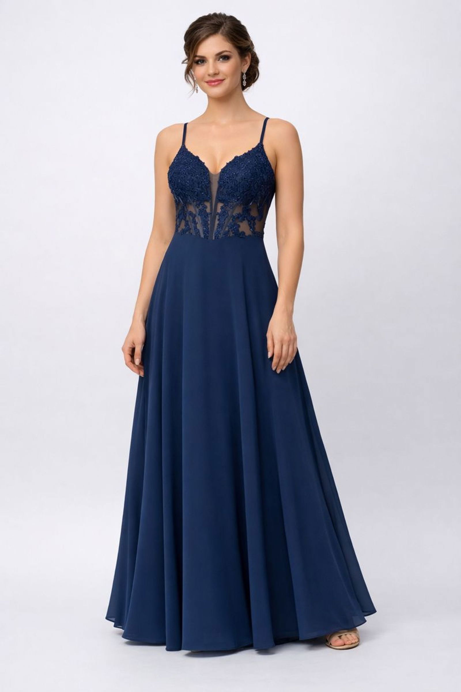 Dieses elegante Abendkleid von Mascara London besticht durch seine klassische Schönheit und den zeitlosen Farbton Navy-Blau. Das bodenlange Design sorgt für eine fließende, feminine Silhouette und eignet sich ideal für festliche Anlässe. Das aufwendig gearbeitete Spitzenoberteil mit floralen Applikationen und zarten Spaghettiträgern verleiht dem Kleid eine romantische Note. Der leicht transparente Einsatz im Dekolleté setzt einen modernen Akzent und betont die Figur auf elegante Weise. Der weich fallende Chiffon-Rock schwingt sanft bei jeder Bewegung und unterstreicht die hochwertige Verarbeitung.
