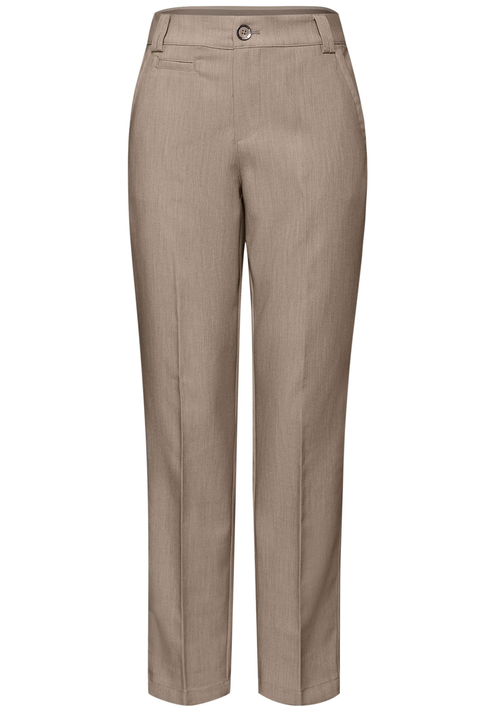 Die Chinohose von Street One für Damen kombiniert ein dezentes Melange-Design mit einem lässigen Casual Fit. Mid Waist, Slim Legs und seitliche Taschen sorgen für eine moderne Form. Der elastische Bund hinten unterstützt den bequemen Sitz. Der stretchige Materialmix macht sie zum perfekten Allrounder für Alltag und Büro. Damenhose im Casual Fit Mid Waist und Slim Legs Seitliche Taschen Elastischer Bund hinten Materialmix mit Stretchanteil Material: 67% Polyester, 27% Viskose, 6% Elasthan