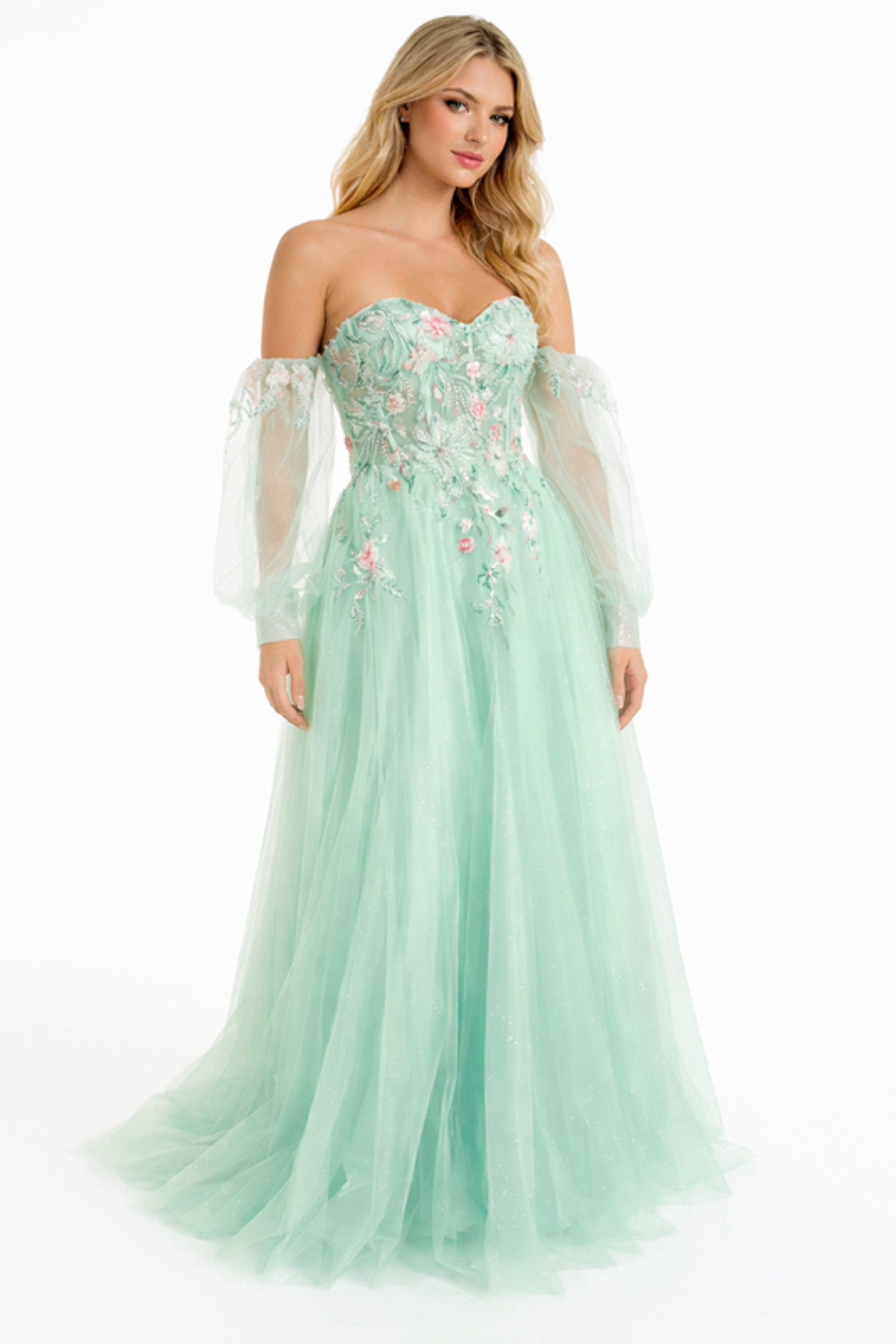 Dieses bezaubernde Abendkleid von Unique vereint märchenhafte Eleganz mit modernen Details und ist die perfekte Wahl für festliche Anlässe wie Abschlussbälle, Hochzeiten oder Gala-Events. Das Kleid begeistert durch sein off-shoulder Design mit zarten, transparenten Puffärmeln, die dem Look eine besonders feminine und romantische Note verleihen. Das aufwendig bestickte Corsagen-Oberteil ist mit floralen Applikationen und feinen Glitzerdetails verziert und sorgt für einen eleganten Blickfang. Der weich fallende Tüllrock in sanftem Mintgrün schimmert dezent und schafft eine wunderschöne, fließende Silhouette. Dieses Modell wirkt leicht, verspielt und gleichzeitig edel ideal für einen unvergesslichen Auftritt.